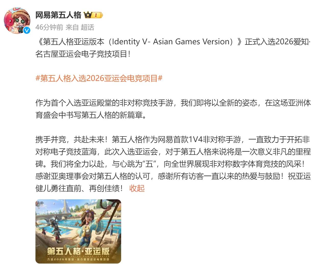 2月23日,网易手游《第五人格》宣布:《第五人格亚运版本(Identity V- Asian Games Version)》正式入选2026爱知·名古屋亚运会电子竞技项目。