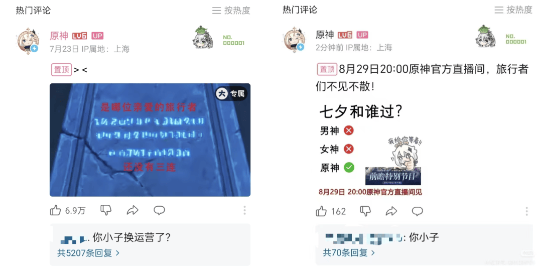 有趣的是,在更加理解玩家的同时,《原神》也变得自信松弛了一点,开始敢于回应社区的声音,甚至玩一些用户吐槽自己的热梗。社交媒体上,玩梗性质的官方评论也多了起来。而这种接地气的沟通方式,本来就是米哈游早年间最擅长的东西。