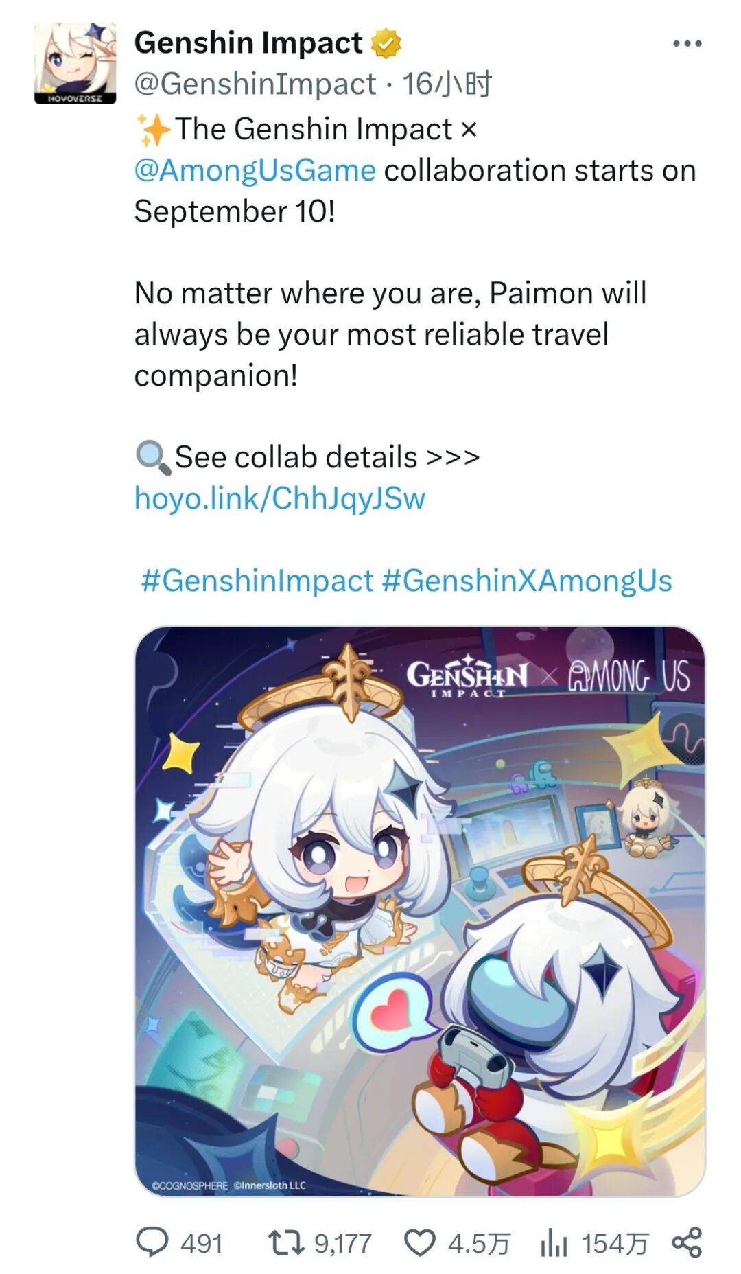 包括就在前几天,《原神》和太空狼人杀游戏《Among us》还官宣了新的联动。我猜对于《原神》来说,这也是在为千星奇域未来引入相关玩法铺路。