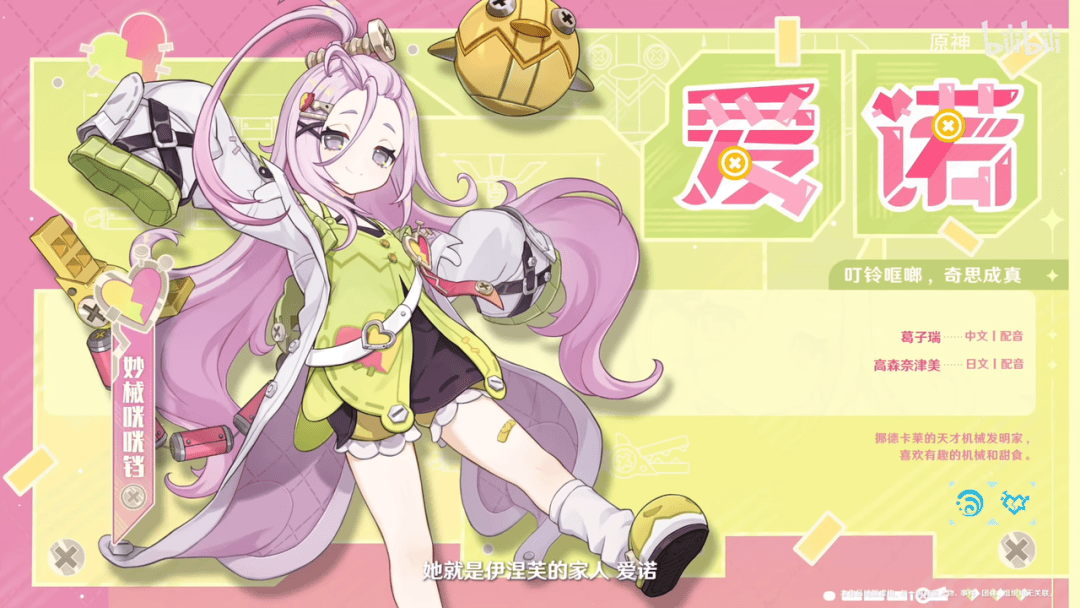 不同的区域与势力,也生存着不同风格的新角色。例如新版本的四星角色:叮铃哐啷蛋卷工坊负责人爱诺就突破了《原神》之前的范式,延续了梦见月瑞希、瓦雷莎等角色更偏二次元的风格。宽松的衣袖、堆堆袜、螺丝形状的发簪和钮扣……在粉毛萝莉这种经典人设的基础上,还隐含了一点儿80-90年代经济上行期的美感。