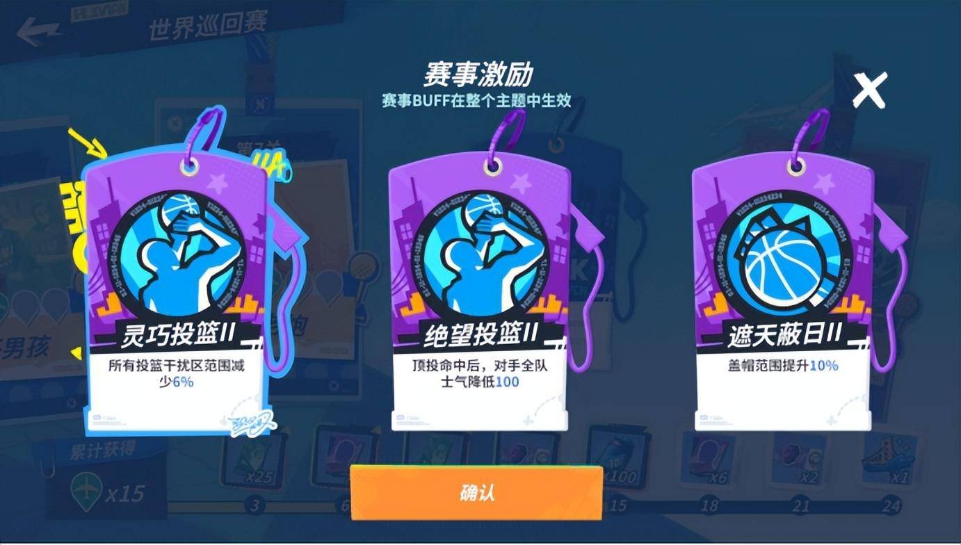 在挑战最终关卡前,街球手们还可以在世界巡回赛中解锁赛事激励获得提升。其中,每个赛事激励都会给队伍带来不同的收益哦~例如,在选择了灵巧投篮的激励后,所有球员都将获得减少投篮干扰区范围的增益,要我说,这时还有谁能够防得住库里这类射手们的出手呢?