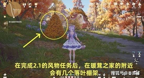 在完成2.1版本的风物任务后,在暖茸之家附近会出现类似圆锥的落叶棚架;