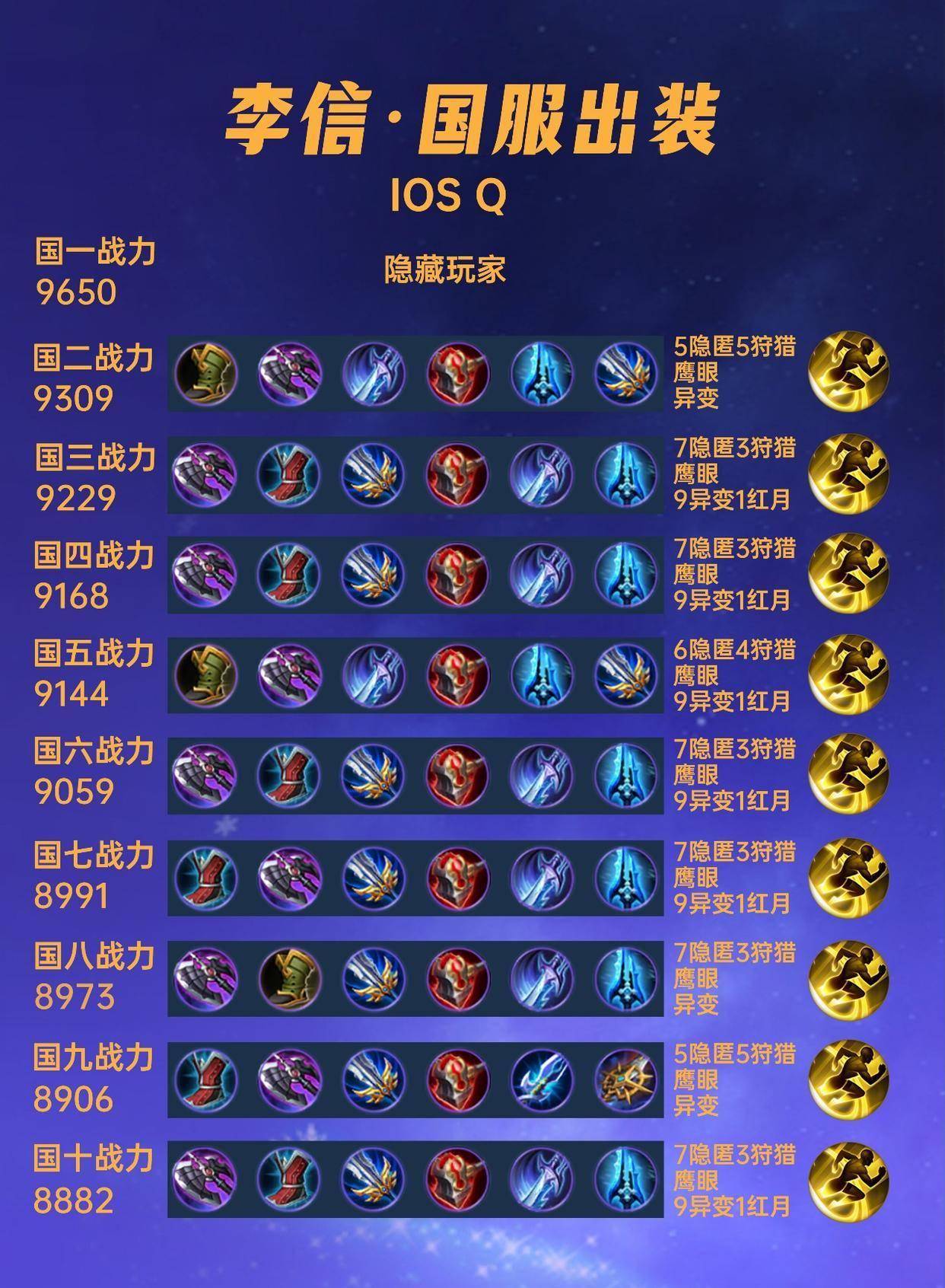 虽然李信经历过一波优化升级,但是出装铭文跟之前的变化不大,看这个路子应该还是光信为主,没有一个国服是偏向于暗信路线的。