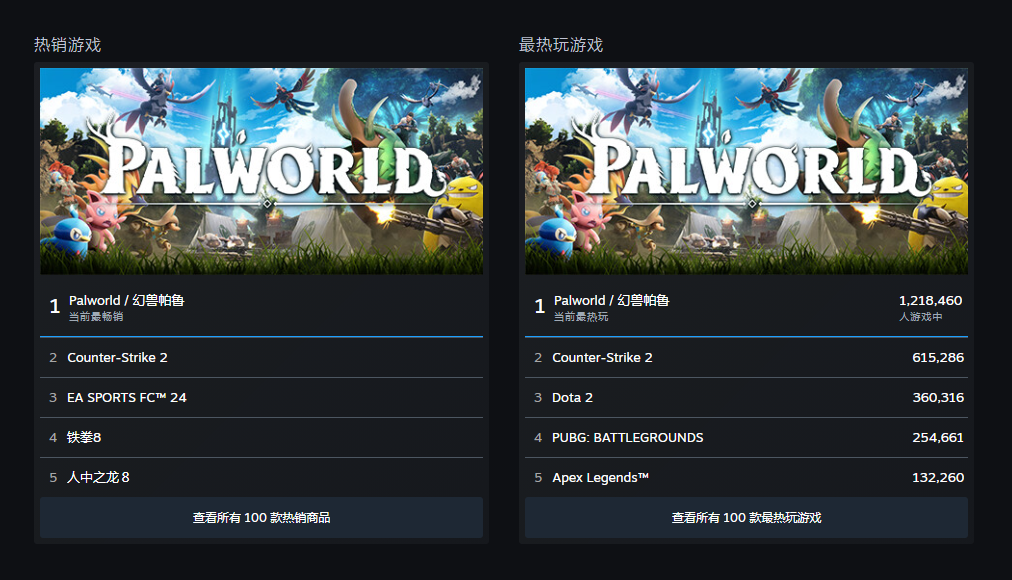 相信大家最近都已经被《幻兽帕鲁(Palworld)》结结实实地刷了一波屏,2024开年的第一部爆款竟来得如此猛烈,四年前《赛博朋克2077》刷新了Steam单机游戏的在线峰值,以105万人的记录打破了《辐射4》保持了五年的47万成绩,而《幻兽帕鲁》一举将这个数字突破到了186万人,历史上能够达到这个成绩的游戏,仅有2018年的《PUBG》,“帕鲁”打败《CS2》一举成为了如今地球上同时游玩人数最多的买断制游戏。