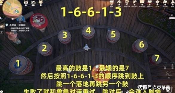4、按顺序跳鼓,顺序完成后触发剧情:1 → 6 → 6 → 1 → 3