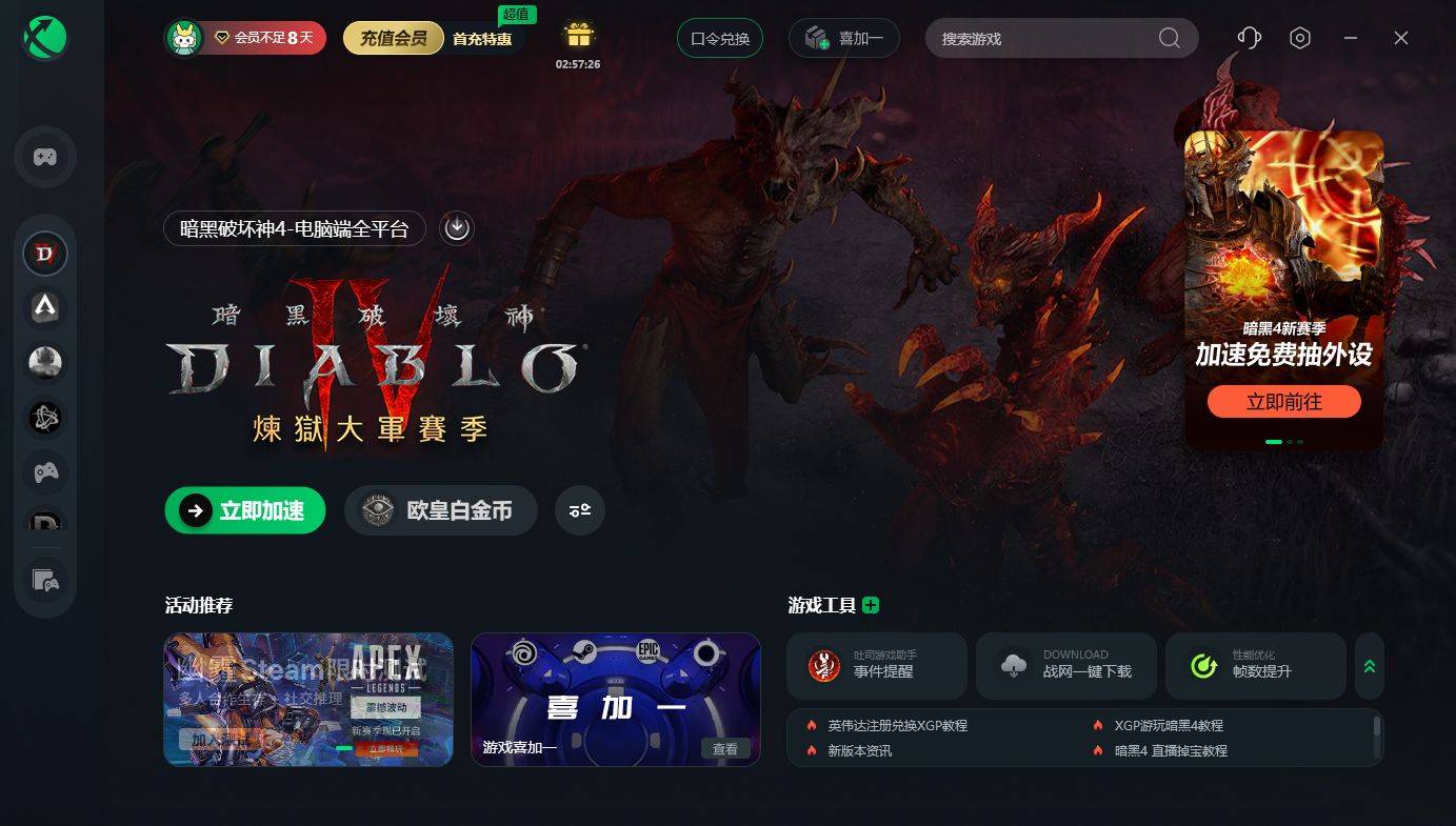 想象一下,你的下载速度就像是个慢吞吞的乌龟,而《暗黑4》的庞大身躯就像是一座需要搬运的大山。这时候,迅游加速器就像是那个手持“加速法杖”的精灵,轻轻一挥,下载速度瞬间飙升,乌龟秒变猎豹!下载迅游,输入“下载如风,暗黑无阻”,还能享受加速时长的小福利哦!选择Steam加速,确保你的网络连接稳如老狗,然后再次尝试下载《暗黑4》,保证你的下载之路畅通无阻!