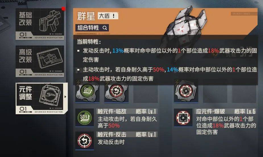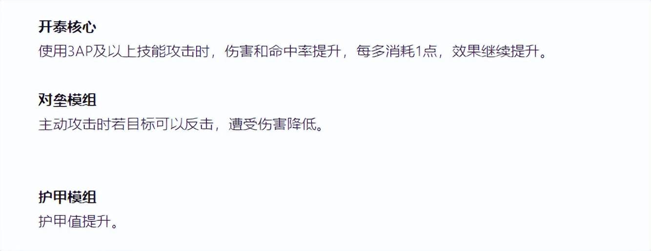 那么这个机兵的意义和定位又如何呢?其关键就是这个“开泰核心”和“对垒模组”的特性了,最为基础模组的“开泰核心”,可以在使用3AP以上技能时提升命中率与伤害10%,这个基础效果配合卡米拉来讲还算合适,特别适配可以消耗全部AP的“死斗”技能,但反过来说其增伤效果也不是100都能触发,比如说我们在使用一些技能打出连动后,自身的AP已不足3点了,此时使用普攻或其它手段攻击时就不能享受到其增伤效果了。