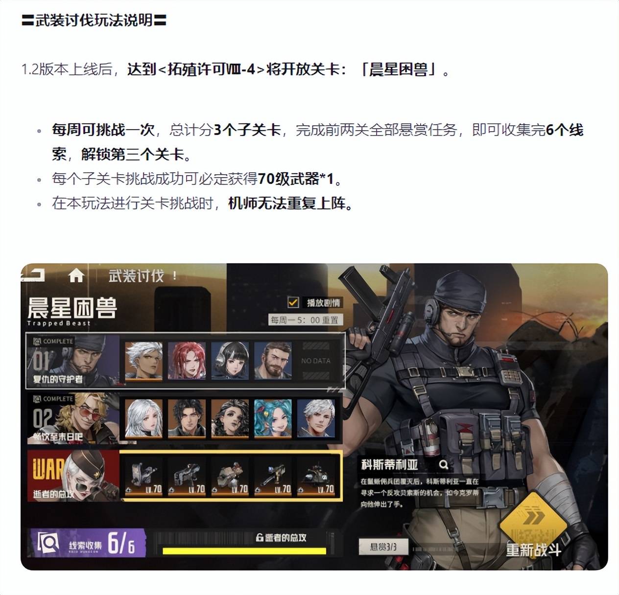 那么最后一个新东西便是“武装讨伐”玩法了,这个玩法在培养和回报上会有对应,比如在某一关上阵过的角色不能重复上阵,但每个子关卡打过之后都会必定获得70级武器,总结而来就是需要我们在培养多位角色组成多个阵容后,能稳定获取武器来源的一个新玩法。