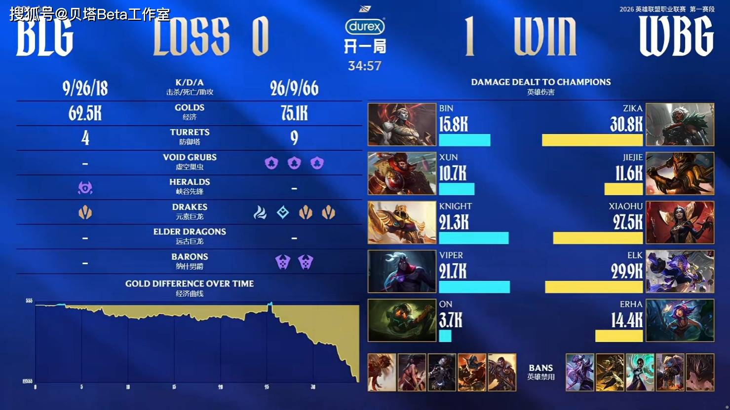 中期25分钟大龙团战,ON泰坦Q到小虎妖姬,将其秒杀,但是knight沙皇空R,WBG四打五完美发挥,ELK芸阿娜收割,WBG打出1换5团灭BLG后,拿下第一条大龙。27分钟bin亚恒被秒,WBG拿下土龙魂。后期33分钟小虎妖姬击杀Viper韦鲁斯,WBG打出0换3后拿下第二条大龙。34分钟BLG河道全技能开ELK芸阿娜,但是没能将其击杀,WBG完美反打击杀BLG四人后,拿下第一局的胜利。首局伤害最高的是Zika安蓓萨,BLG这边伤害最高的是Viper韦鲁斯。