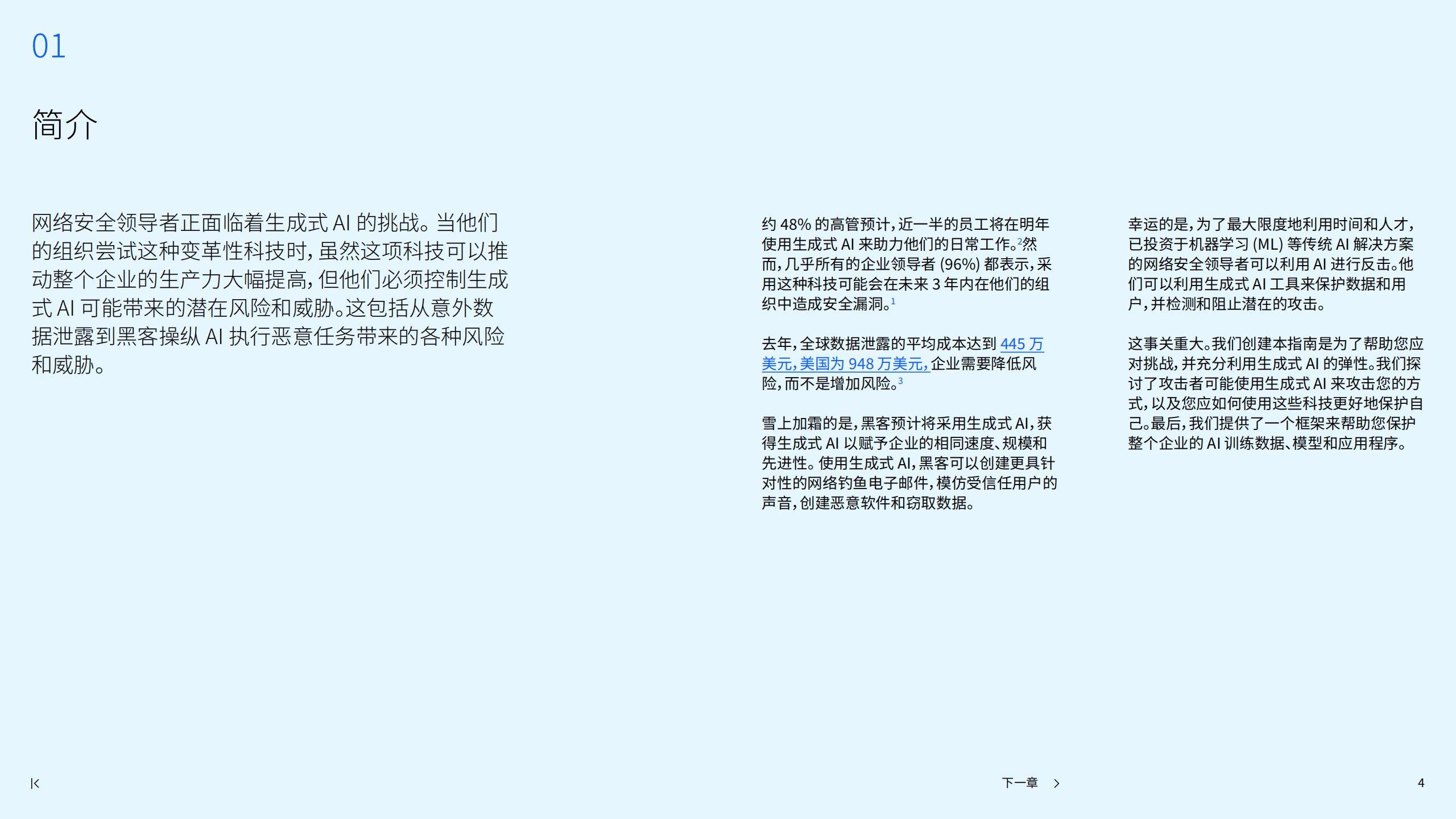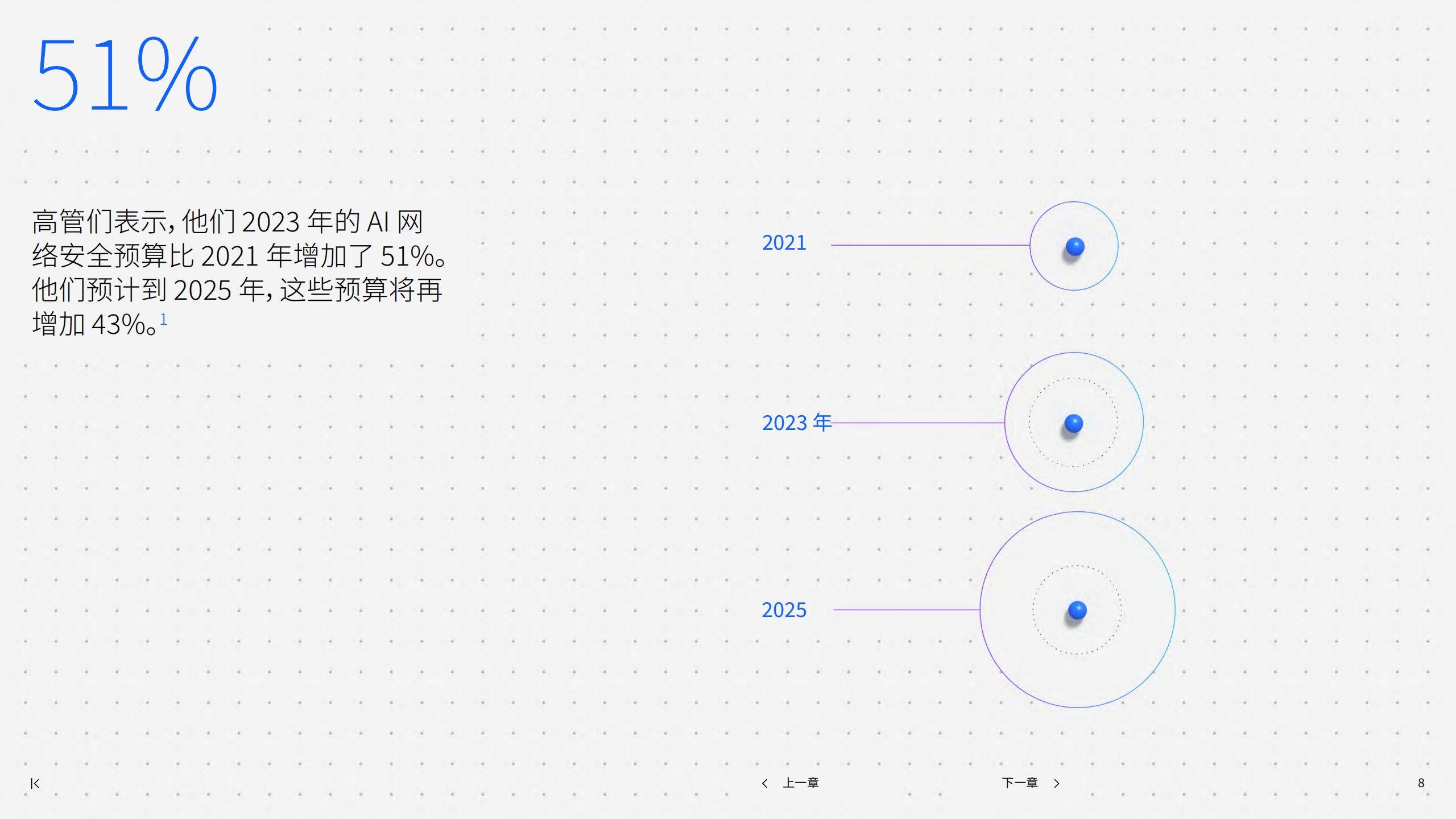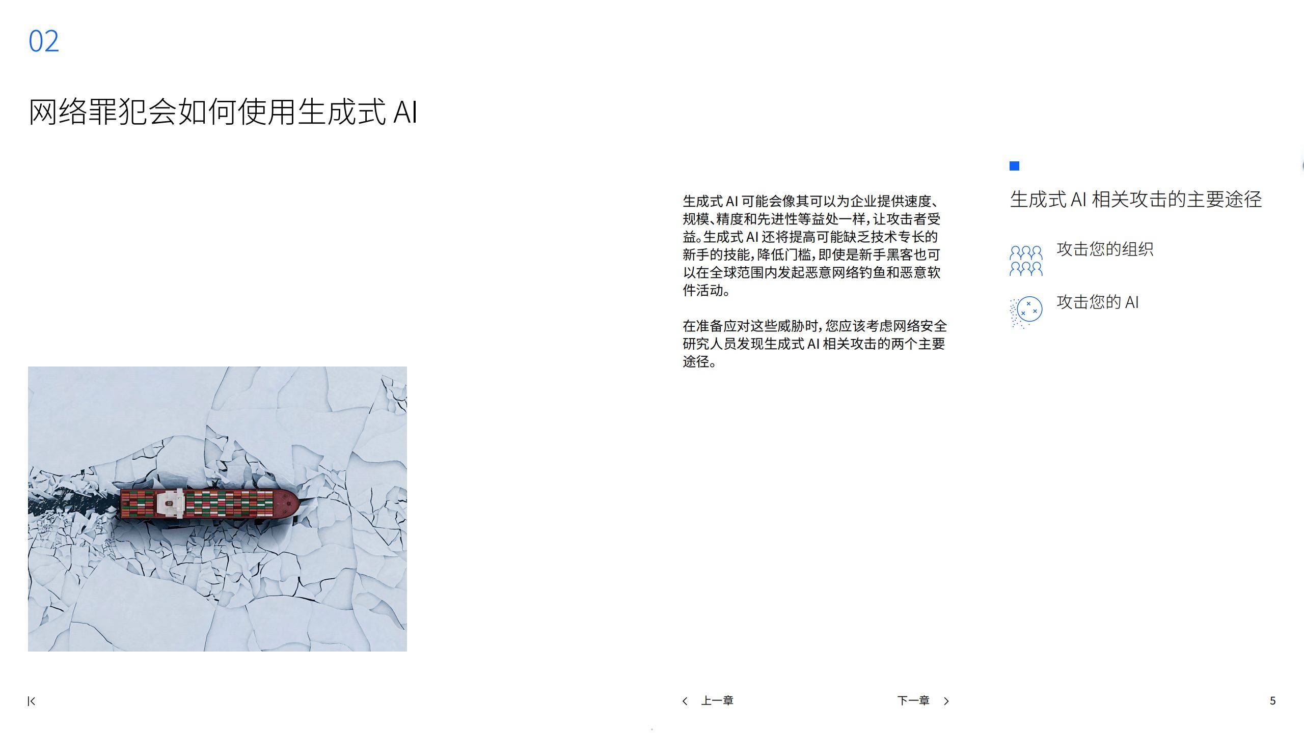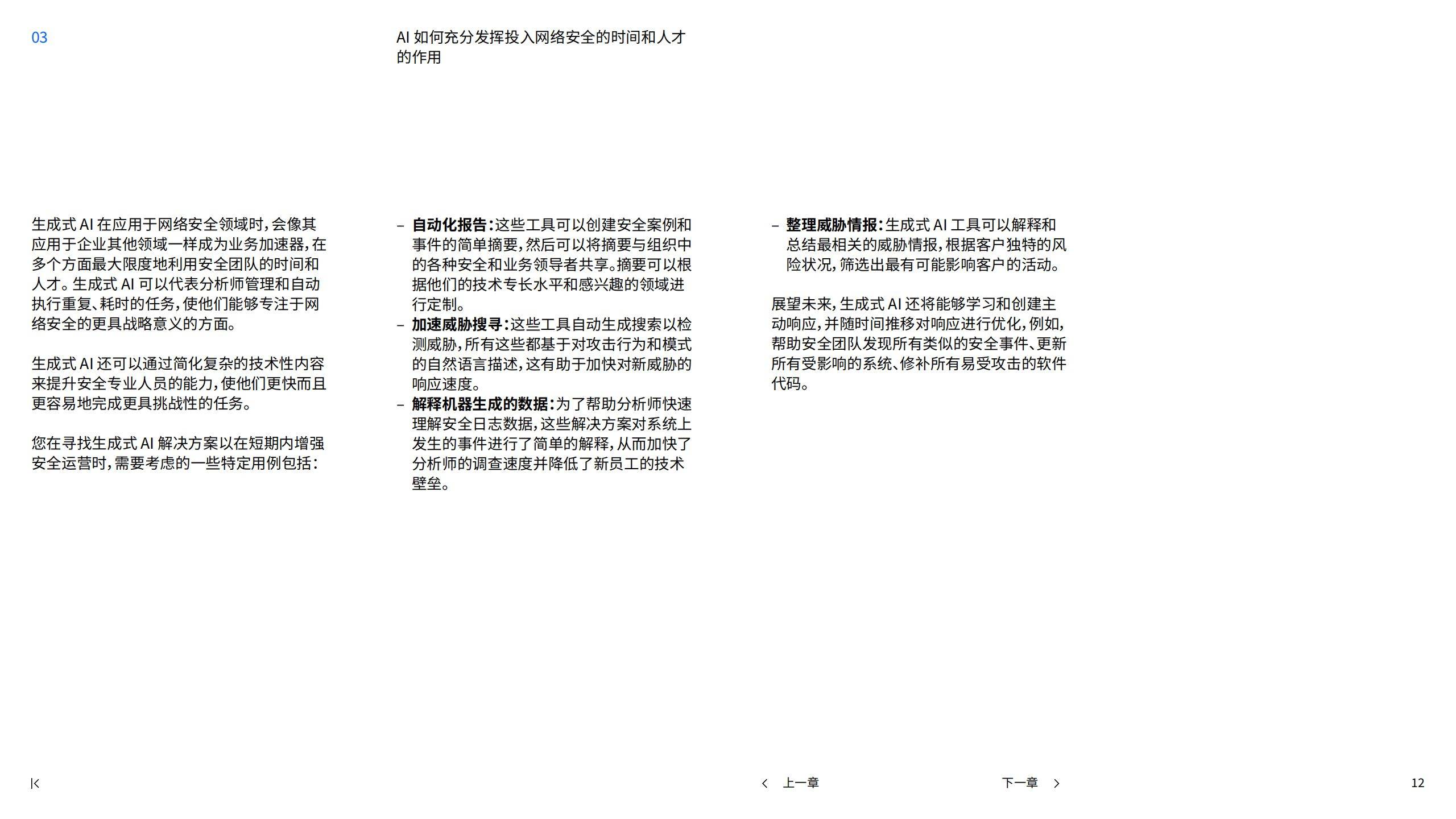 网络安全领导者面临人手和技能短缺、敏感数据激增、基础设施复杂性增加和攻击面扩大等内部挑战,导致SOC分析师时间浪费和工作效率低下。传统AI解决方案使用机器学习帮助评估风险和推荐应对措施,具有缩短发现和遏制泄露时间、监控网络通信和节省成本等优点。生成式AI将改变这一局面,64%的高管已将网络安全确定为生成式AI用例的首要任务,84%的人计划优先考虑生成式AI网络安全解决方案。生成式AI可代表分析师管理和执行任务,提升安全专业人员能力,具体用例包括自动化报告、加速威胁搜寻、解释机器生成的数据和整理威胁情报等,未来还将能够学习和创建主动响应并优化。