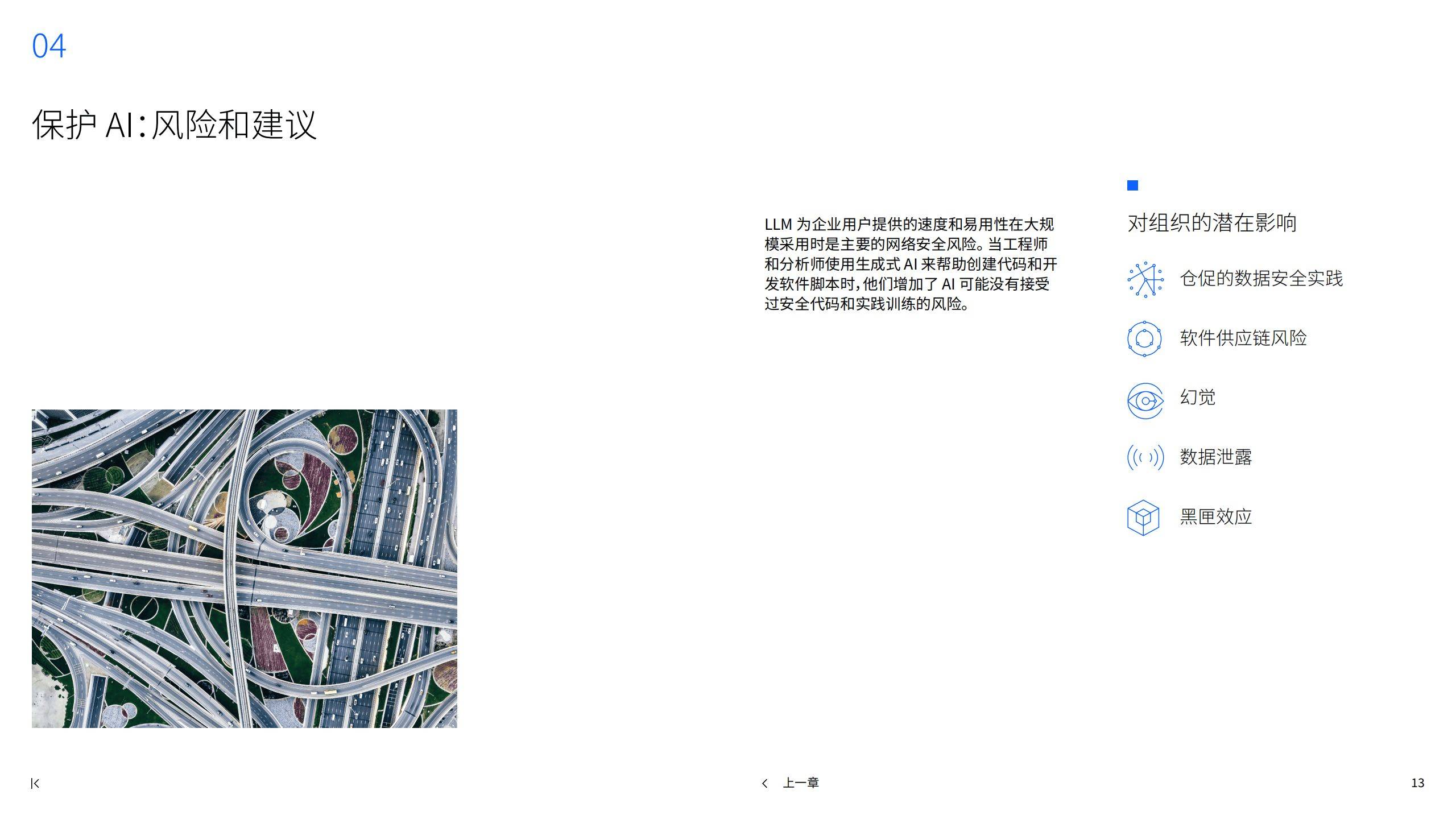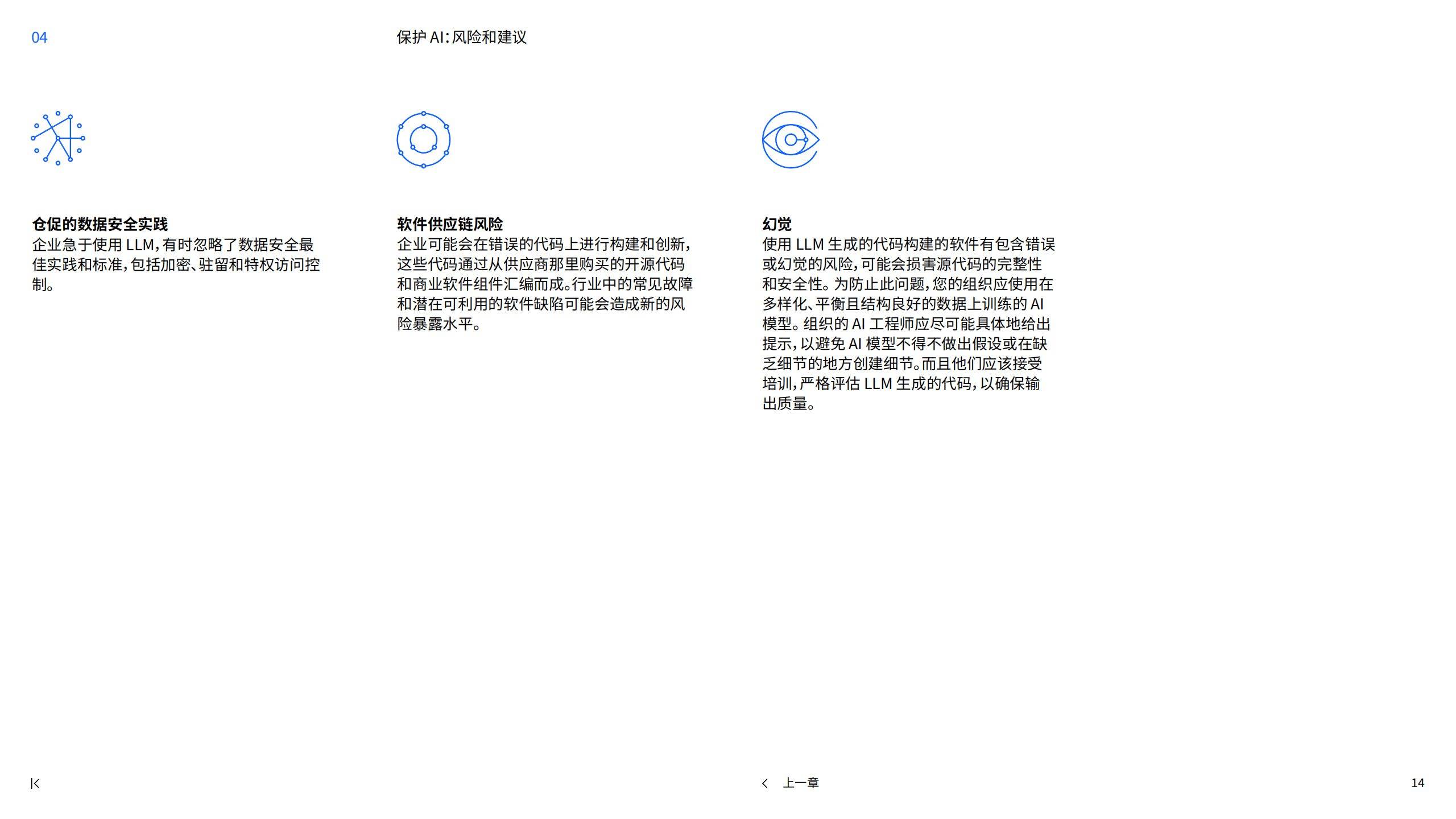 - 软件供应链风险:工程师和分析师使用生成式AI创建代码和开发软件脚本时,可能增加AI未接受安全代码和实践训练的风险,企业可能在错误代码上构建和创新,导致新的风险暴露。