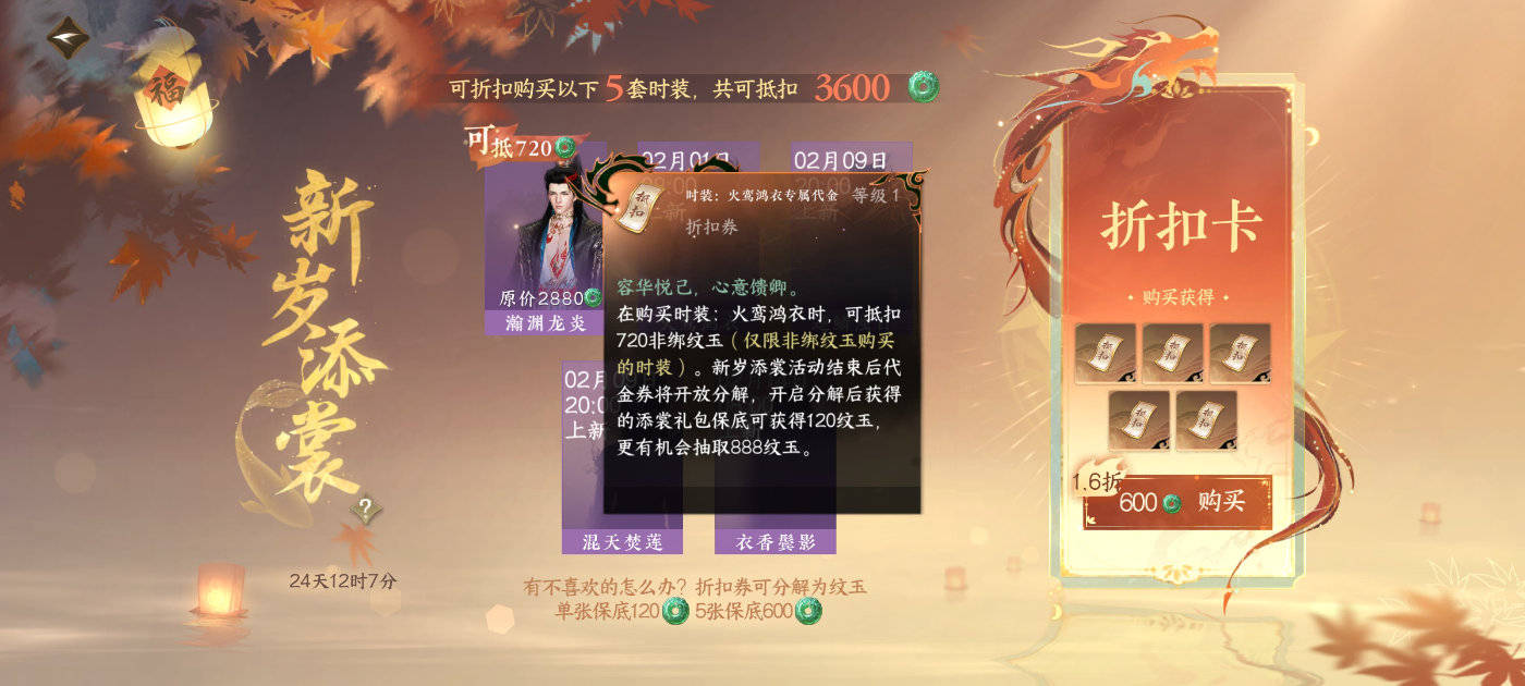 为了让我们以最实惠的价格获得最喜欢的时装,《逆水寒》手游还给我们准备了多个时装抵用券,使用抵用券后5套时装一共可以抵扣3600纹玉,十分划算,有了这些时装抵扣券,大家可以把自己喜欢的时装全部拿下了!