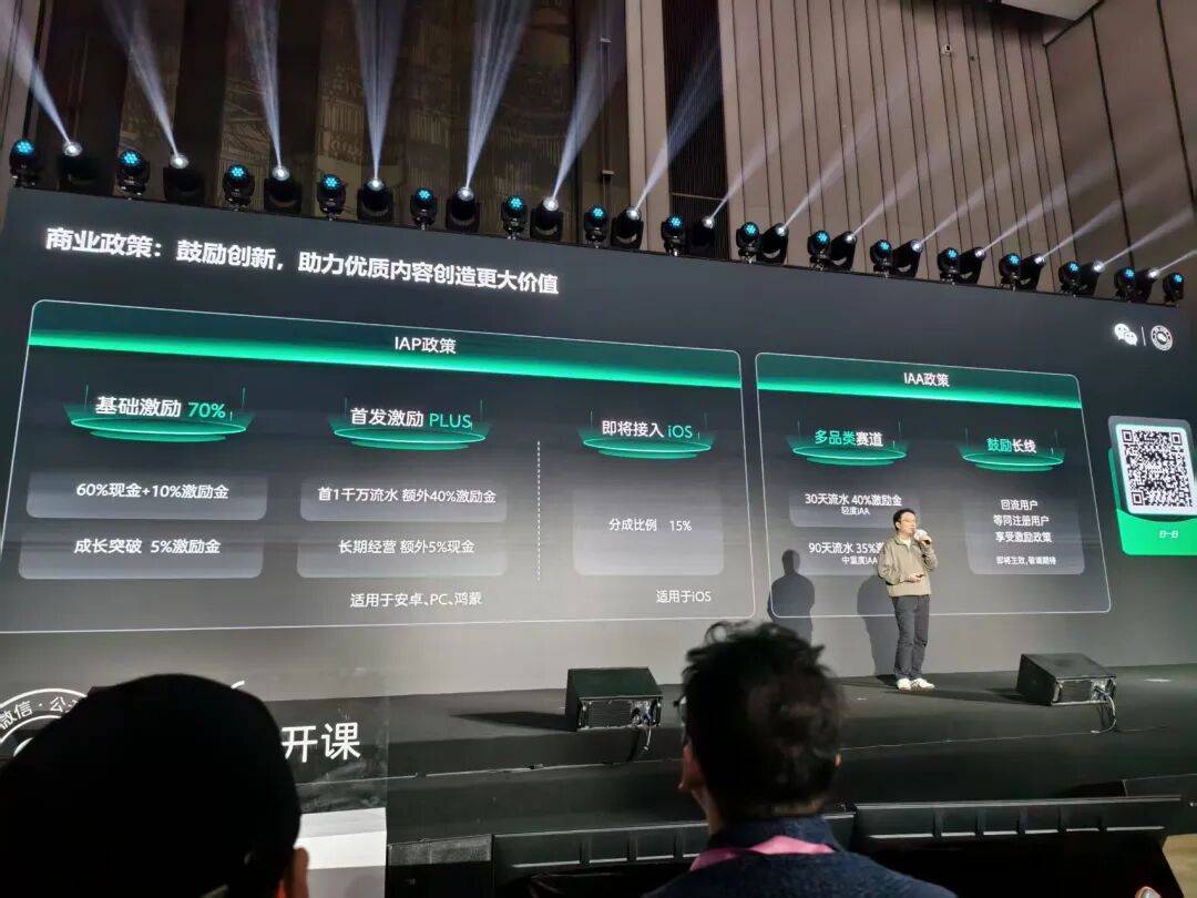 另外一个是大家比较关心的iOS小游戏支付的进展,我在这里向大家汇报一下,我们已经在跟苹果对接中了,预计很快的就可以在IOS上接入小游戏的支付系统。而且在iOS上的分成比例,会直接按照固定15%的比例来抽取。