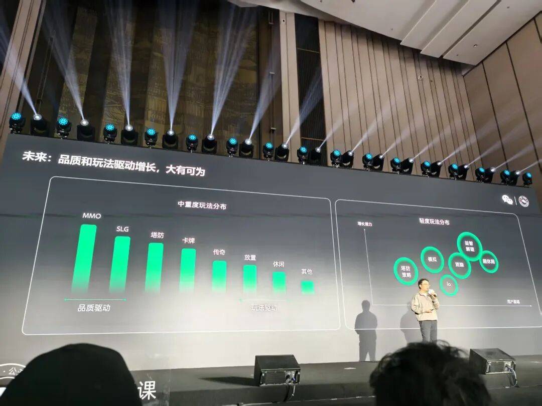再来看右边这个图,代表的事当前IAA轻度玩法的分布情况,其中圆圈代表当前品类的发展规模,横轴代表人群基础,竖轴代表的则是我们对这个品类未来发展机会的判断。从这个图可以看出,益智消除和模拟经营等玩法,又非常大的潜力空间,IAA赛道的这些品类应该都有一些机会值得关注。
