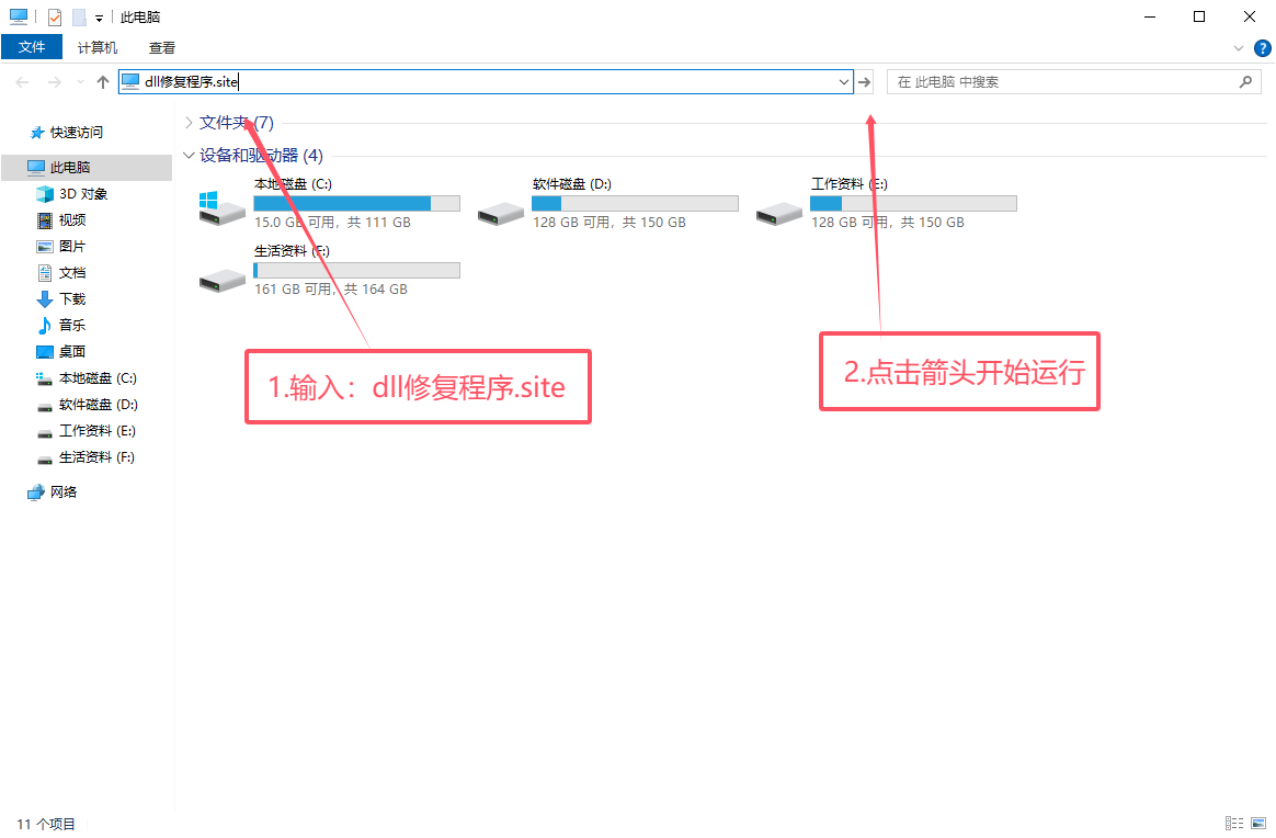 2.进入此电脑以后,在顶部文件路径输入:dll修复程序.site(鼠标移到右侧的箭头点击)打开系统dll文件检查工具。