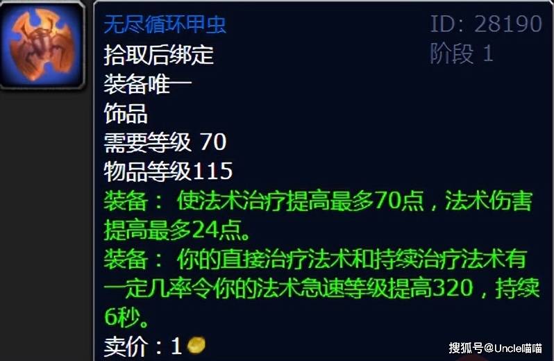 把黑色沼泽埃欧努斯的这款治疗饰品无尽循环甲虫抬上来,很大一部分原因是因为喵叔当年玩个萨满,佩戴了他很久很久的时间,70点法术治疗提高绝对不算低,最重要的是被动的6秒320点急速等级提高对于拉面师傅的收益是恐怖如斯的,个人感觉特别是大后期排骨点的奶萨,完全有理由锁格子!