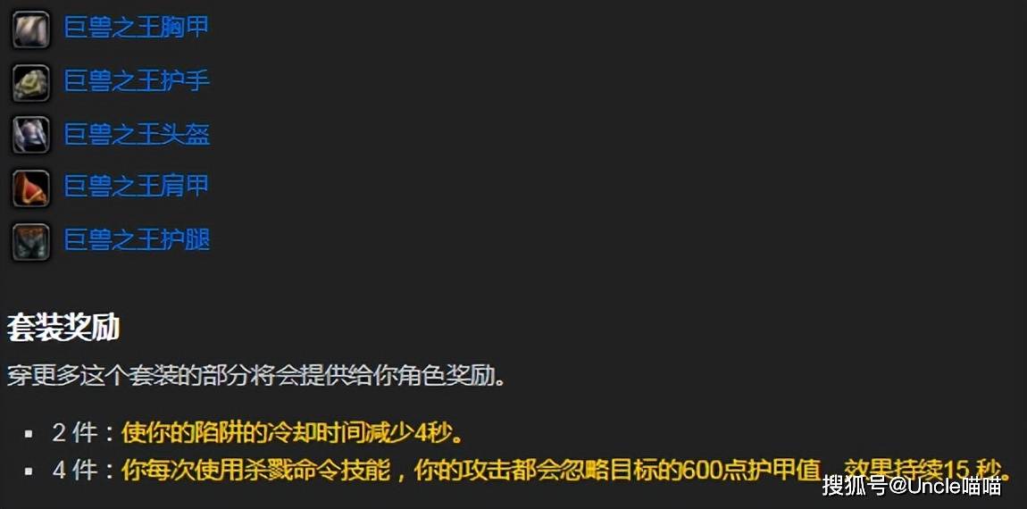 猎人T4套装的拉跨,也是注定了巨兽之王套装的崛起,不过论输出T4套装肯定是不如巨兽之王套装的,但是对于喵叔这种喜欢紫色装备的就无所谓了,这套装备,喵叔当年玩血精灵猎人的时候印象深刻,特别是生态船迁跃扭木巨兽之王胸甲和蒸汽地窟督军的巨兽之王肩甲特别掉率低,非常难刷,不知道各位猎人大兄弟凑齐一套花了多久时间?