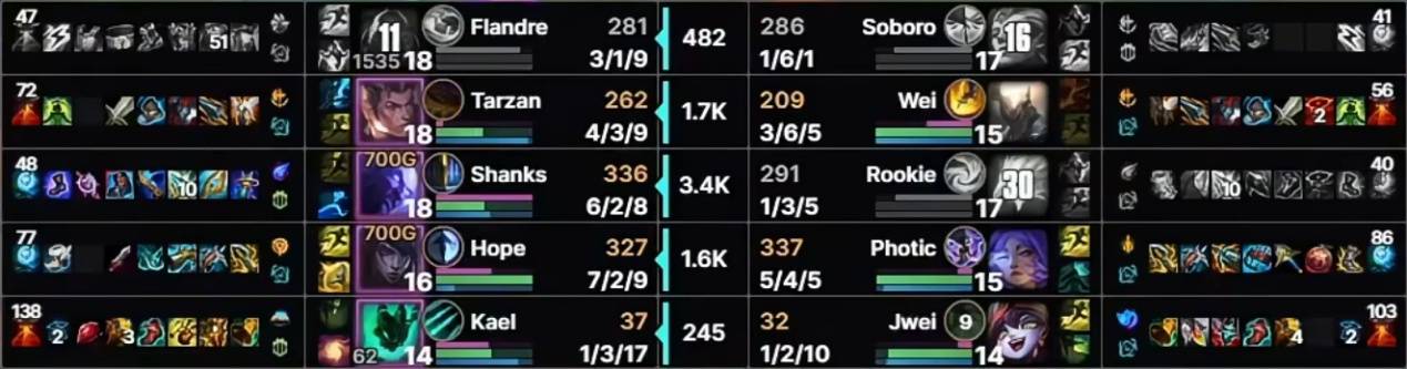 Rookie中路强行拼单杀成功后自己也阵亡,下路方面IG则遭遇接连针对,Hope回到联赛后再次爆发,一手韦鲁斯全场砍下13次击杀,最关键的一波下路反围剿打得IG一点脾气都没有,最后Shanks一波精彩大招为Hope创造输出空间,一波四杀结束比赛。