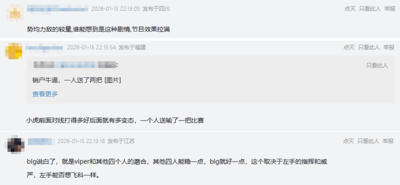 对于这场比赛,网友则表示:“势均力敌的较量,谁能想到是这种剧情,节目效果拉满”、“小虎前面对线打得多好后面就有多变态,一个人送输了一把比赛”、“BLG说白了,就是viper和其他四个人的磨合,其他四人能稳一点,BLG就好一点,这个取决于左手的指挥和威严,左手能否像Faker一样”。