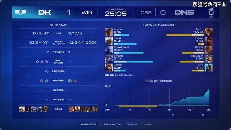 结果第一局比赛,两队各打了半场好局,DK笑到了最后。2分钟左右,猴子灵活绕后配合队友击杀DK下路双人组;11分钟左右,猴子拿到小龙,后续DK开团打出0换3;14分钟左右,DNS中野配合在野区击杀奎桑提;15分钟左右,DK野区发难打出0换3大获全胜;16分钟左右,奎桑提配合露露击杀兰博;19分钟左右,兰博在上路被瑞兹击杀;23分钟左右,猴子拿到小龙,后续DK果断开团打出0换5团灭;最终25分05秒,DK团灭DNS后,直接一波