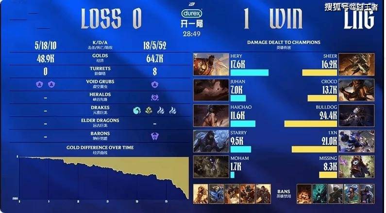 结果第一局比赛,被LNG打成了单方面的碾压局。7分钟左右:皇子gank下路击杀对方牛头拿到一血,随后配合芸阿娜收掉对方下野打出一换三;9分钟左右:LNG野区抓到石头人拿下人头;17分钟左右:LNG出击上路集火抓掉阿卡丽;24分钟左右:双方河道爆发团战,LNG击杀奎桑提后保住芸阿娜,芸阿娜开大输出无人能挡打出一换四;28分钟左右:LNG携大龙推上高地,发条大招拉到三人皇子盖大打出团灭一波结束比赛。