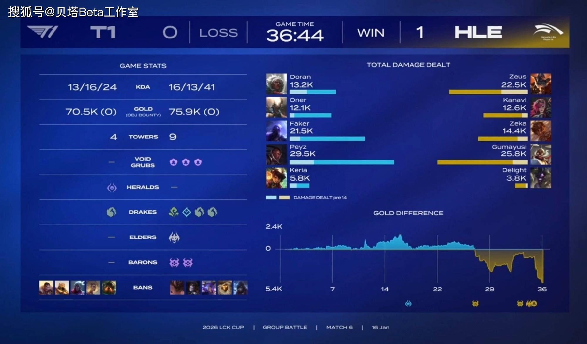 中期17分钟HLE拿下听牌龙。27分钟HLE在中路找到机会击杀Peyz卢锡安,虽然Faker瑞兹换掉kanavi蔚,但是正面战场HLE打出1换4后,拿下第一条大龙和水龙魂。后期30分钟HLE抓Faker瑞兹,Faker反打单杀Zeka岩雀,但是自己也被HLE众人击杀。34分钟HLE光速拿下第二条大龙。35分钟delight牛头配合Zeus兰博大招防住T1众人,HLE拿下远古龙后团灭T1,拿下第一局的胜利。首局伤害最高的是Peyz卢锡安,HLE这边伤害最高的是Gumayusi飞机。