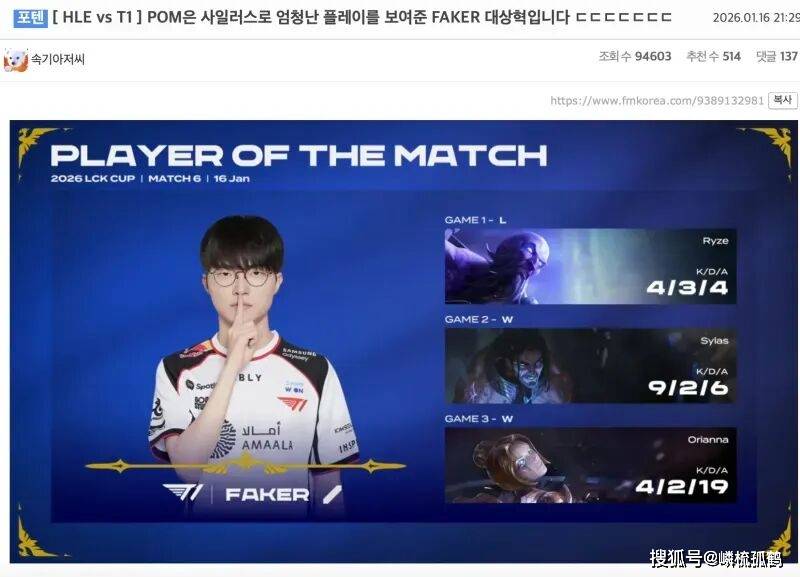 2026LCK杯T1以2比1战胜HLE后,韩国FMKOREA论坛网友对此展开热议