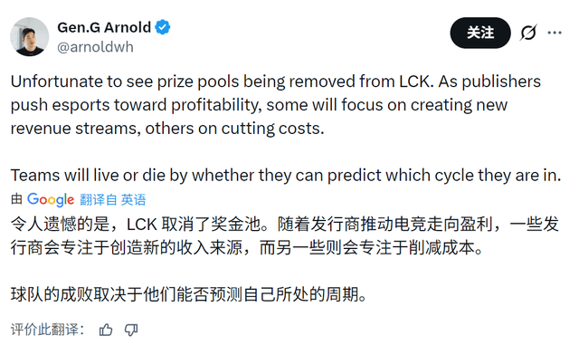 未来难以预料,但当下的变化正在发生。相关改革推出后,GEN.G俱乐部CEO Arnold立即发推表示:“非常遗憾看到LCK的奖金池被取消。”