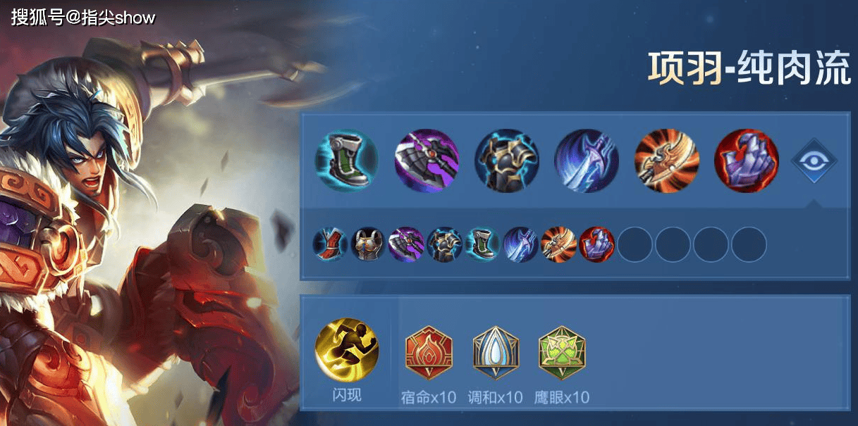 出装方面我还是推荐一下上赛季我的出装思路,不要求极致的输出,更多还是考虑输出和坦度的综合属性,破军当然强,半血以下大招必杀,但其实项羽开大的时候往往对面都是状态不错的,所以我更多的会考虑综合素质,而不是技能点都加在一个方向。