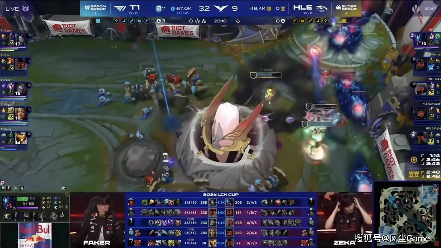 前期大O围绕中路拿到优势,团战T1又是连续获胜,15分钟领先4.4K,多兰阿卡丽团战各种收割,打到20多分钟,T1就开始冲高地杀人了,比赛28分钟结束,两队人头比达到了夸张的32:9,HLE全程没推掉T1一个塔,小龙也只拿到了一条,属于是被打成人机了,毫无还手之力的那种。