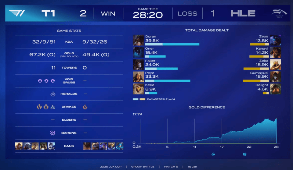 最近LCK那边2026年新的赛事也开始了,对于这个新赛季来说,大家关注点也无非是那前排的几支队伍,完整体有着Chovy和Ruler的GEN,全新银河战舰的HLE,那个无法越过的高山T1,还有Showmaker和bdd带队的DK和KT,而那个由Scout加入后的小战舰NS好像在这几支队伍面前还不够看吧!当然不管在哪个赛区都这样,头部之争,但也偶尔会有一些以下克上的好戏!近日的一场常规赛BO3对局里,迎来了来自T1对阵HLE的强强对话,这两支队伍相爱相杀,从去年到今年似乎都是从转会开始,所以也一直都有着“新老队友”们之间的相遇!