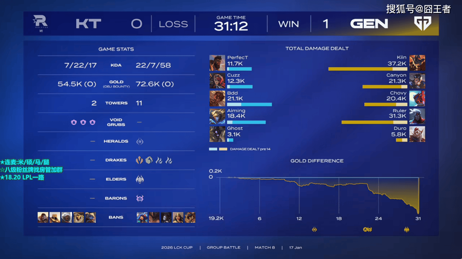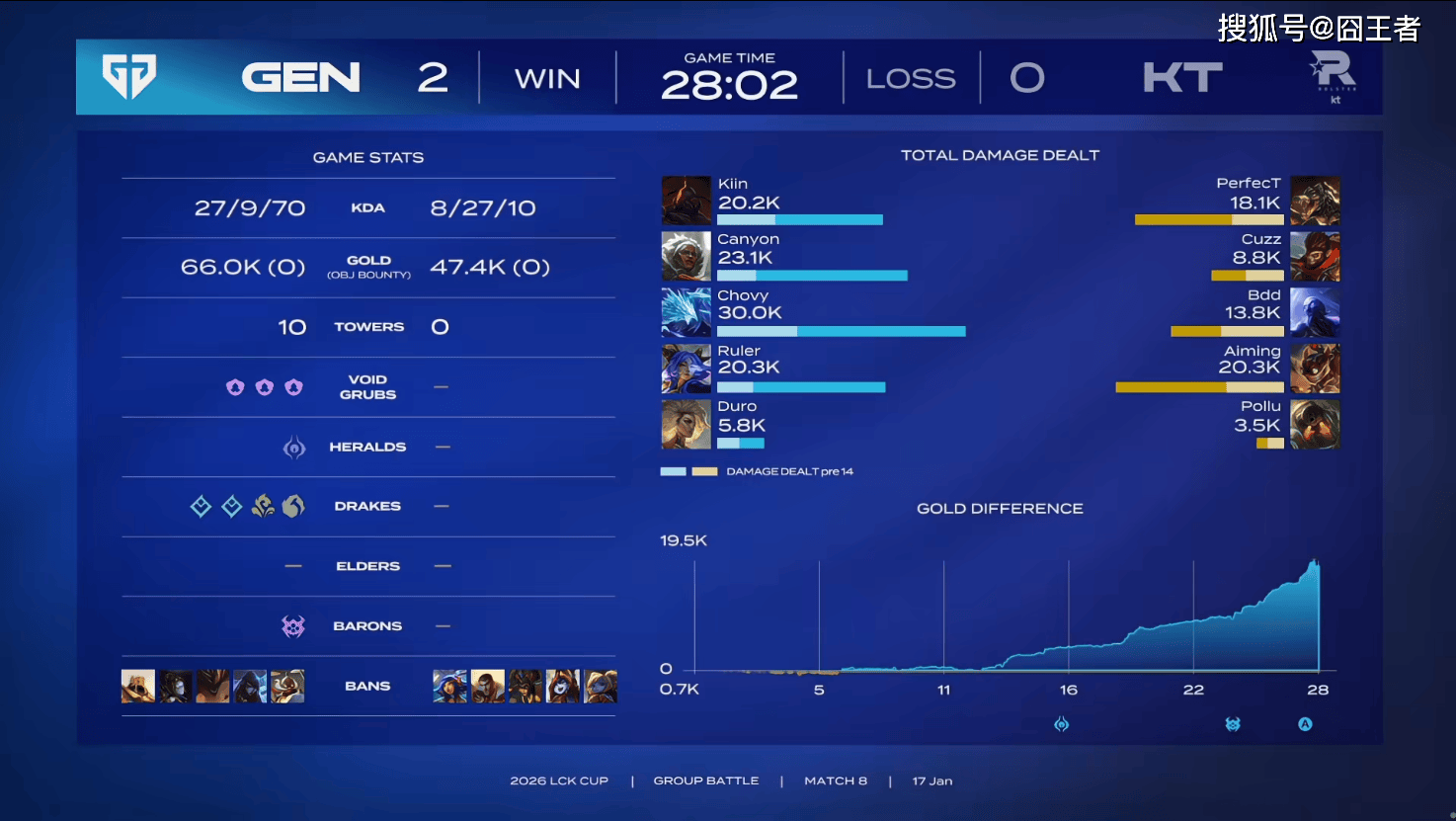 结果第一局比赛,被GEN打成了单方面的碾压局。比赛第12分钟左右,GEN小龙团打出0换2,此后GEN一度打出4k经济领先;比赛第22分钟左右,Kiin兰博爆炸输出打残KT双C,GEN小龙团0换5击溃KT;比赛第25分钟左右,Kiin兰博单杀Bdd岩雀爆砍双杀,GEN四打五打出1换5大胜;最终比赛第31分12秒,GEN再度打出0换3随后破下路高地,然后一波团灭KT,先赢一局!