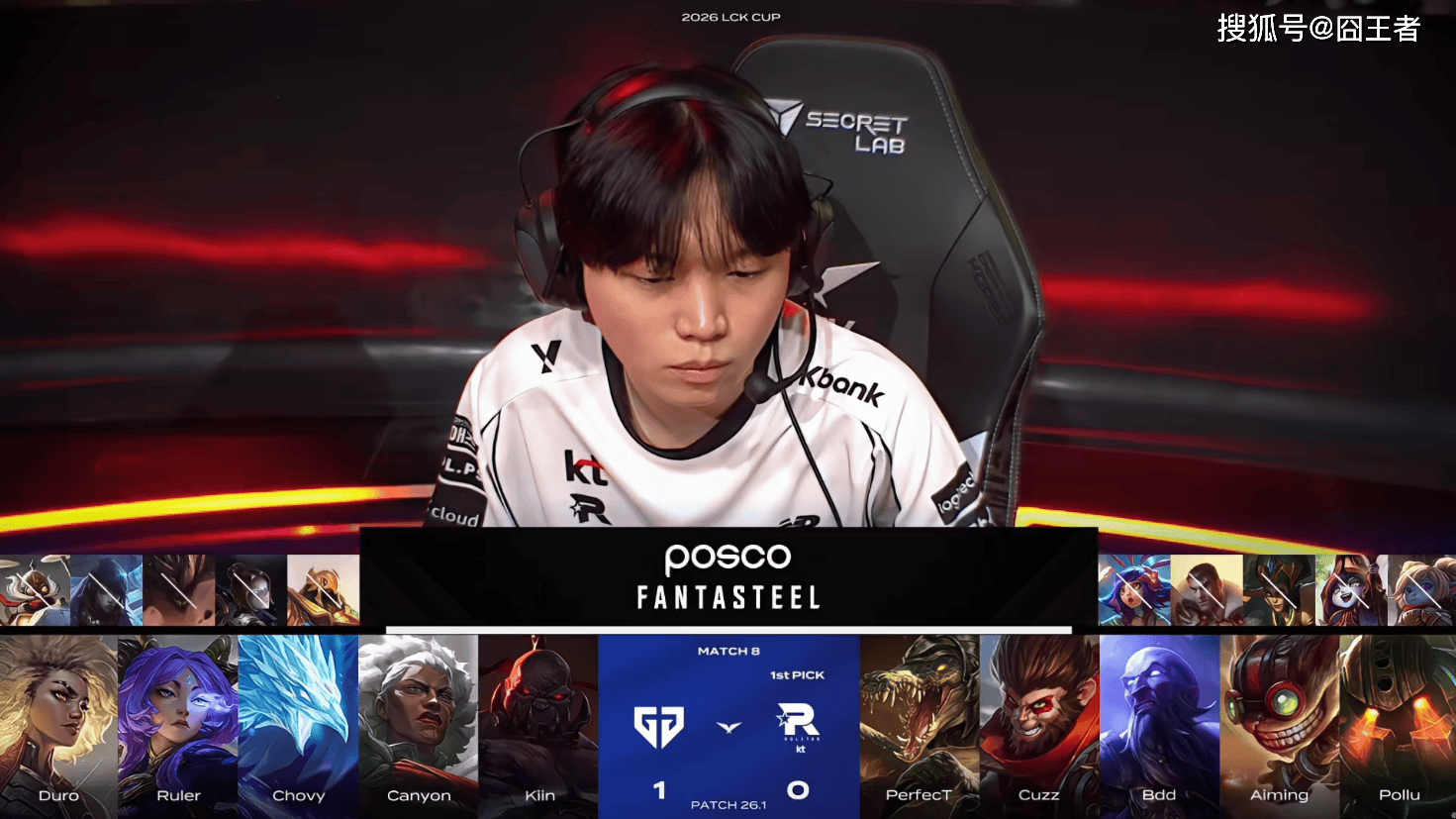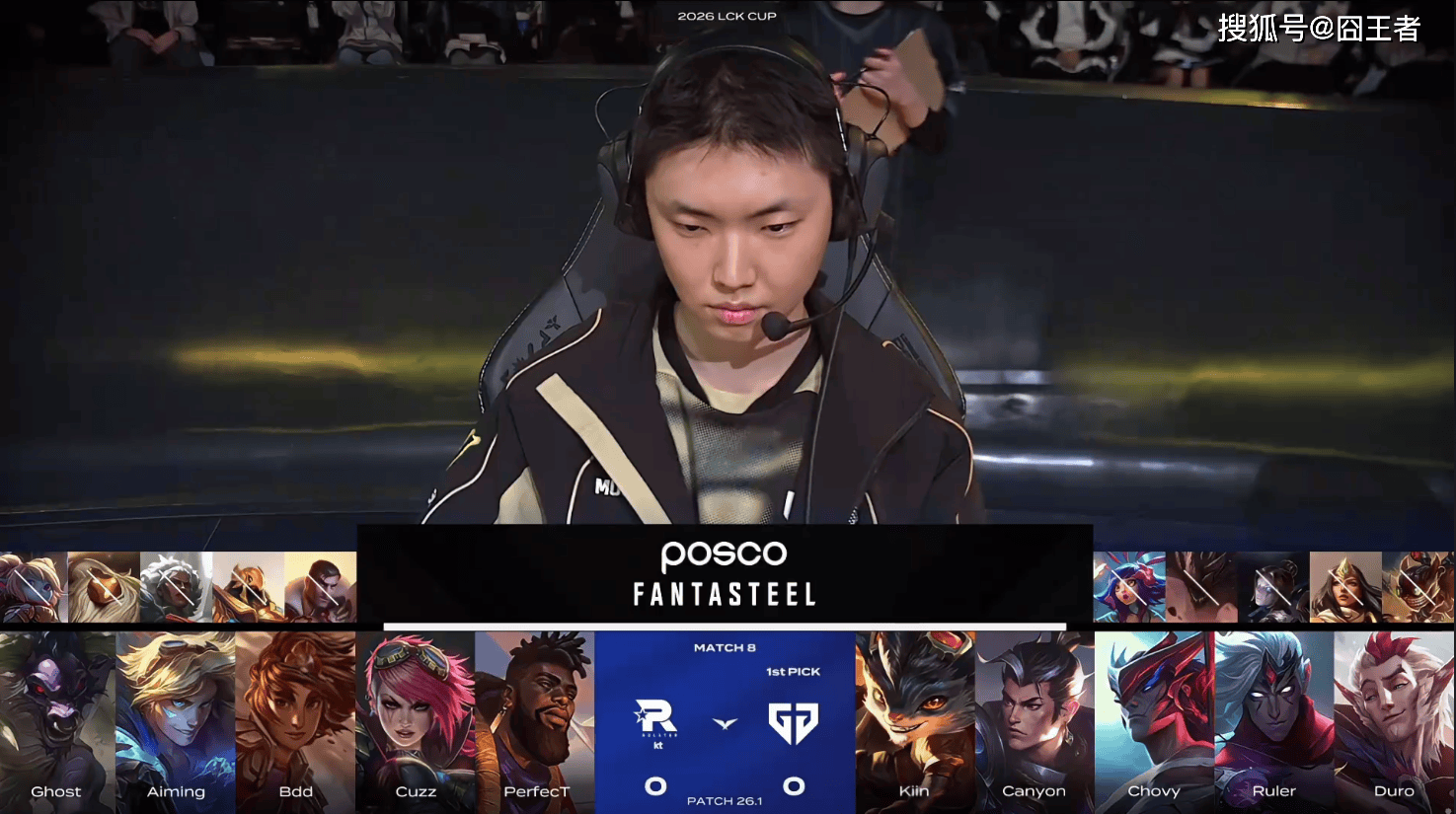 第一局比赛,K T蓝色方,禁用:杰斯、沙皇、安蓓萨、巴德、波比,选用:PerfecT奎桑提、Cuzz蔚、Bdd岩雀、Aiming伊泽瑞尔、Ghost牛头;G EN红色方,禁用:妮蔻、石头人、发条、希维尔、炸弹人,选用:Kiin兰博、Canyon赵信、Chovy永恩、Ruler韦鲁斯、Duro洛