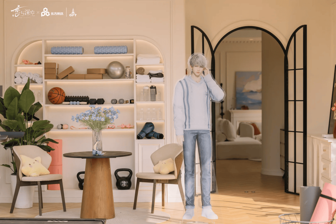 沈星回所在的健身房里摆着星辰花,祁煜的画作被安放在厨房一侧,各类象征性的玩偶也都放在家里。各个区域都能看到男主的亚克力立牌,存在感被自然地嵌进了这个新家里。
