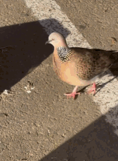 珠颈斑鸠虽然和乌鸫一样都是两条腿走路,但它的脖子会随着走路一缩一缩的。