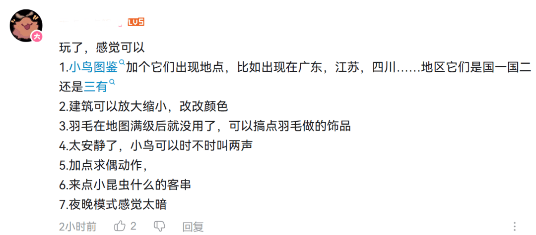 目前测试版可观测到的鸟就已经高达16只了,在获得新鸟以后,可以点开图鉴来查看一些鸟类的小科普,有些鸟还有公母差异。而需要收集齐这些鸟,姬一边摸鱼一边摸鸟,至少要花上三小时的时间。在做别的事的时候打开游戏挂在一旁,现实中的鸟叫声配合温馨的背景音乐,当一个白噪还是非常不错的。
