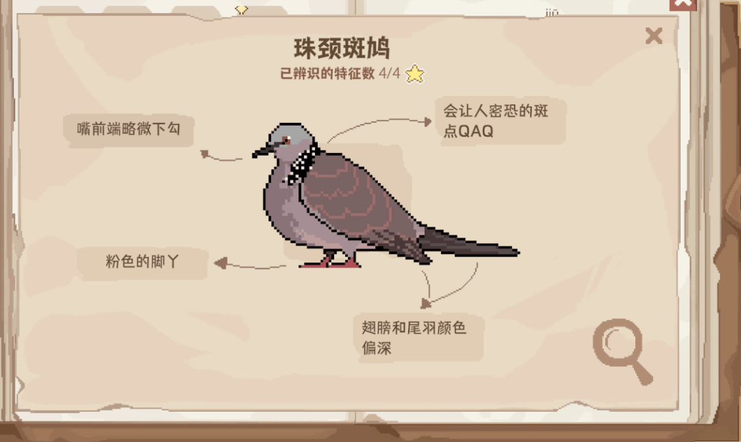 姬在第一次见到珠颈斑鸠的时候,真的是“先闻其声未见其身“,当耳机里传来了熟悉的“咕咕咕”的声音,姬便知道来了一位熟悉的老朋友——为了让大家观鸟更有代入感,游戏里面所有鸟的声音都采用了现实中的叫声,如果想无数次听“咕咕咕”,直接点开图鉴就可以了。图鉴不光收录了鸟的外形和声音,还收录了鸟的喜好之类的,以及以防大家不认识鸟名字中的生僻字,官方还特地标注了读音。