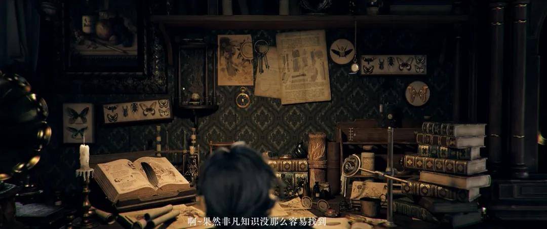 前半部分节奏轻快、阳光明亮。开场是主角的房间,欧式古典风格,蝴蝶标本、书页笔记被随意地钉在墙上,巨大的书桌上能看到蜡烛、羽毛笔、羊皮卷、四处堆放的书籍,神秘学气氛浓郁。