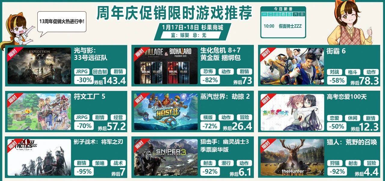 朋友们!杉果商城的“十三周年特惠”正在火热进行中,上千款好评游戏正在史低折扣,除了基础优惠之外,领取满减券立享折上折,而且老朋友与新注册用户还都能获得 8.8 折起的超值大额神券。感兴趣的朋友可以前往杉果商城了解详情。