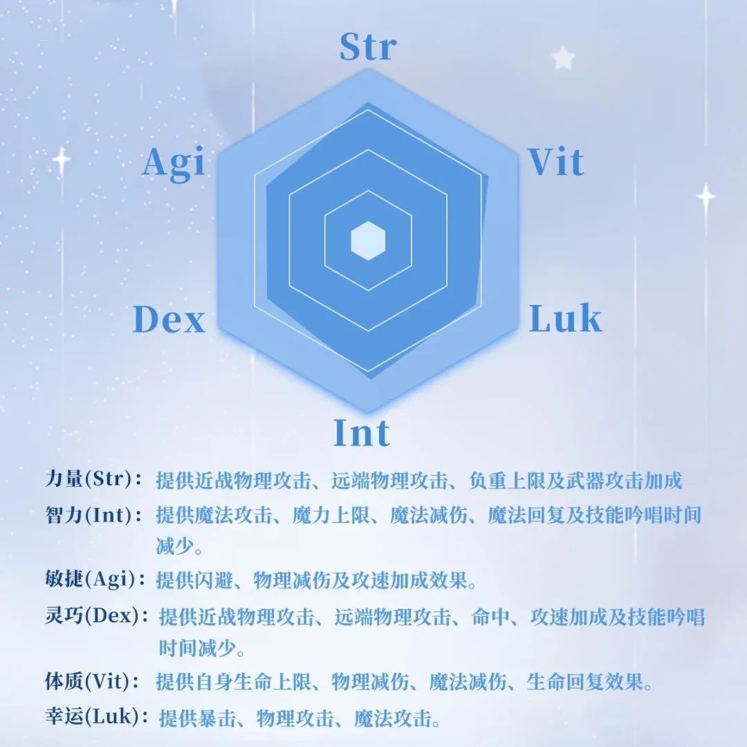 在游戏中,总共有六大属性,分别是力量(Str)、敏捷(Agi)、体质(Vit)、智力(Int)、灵巧(Dex)和幸运(Luk)。