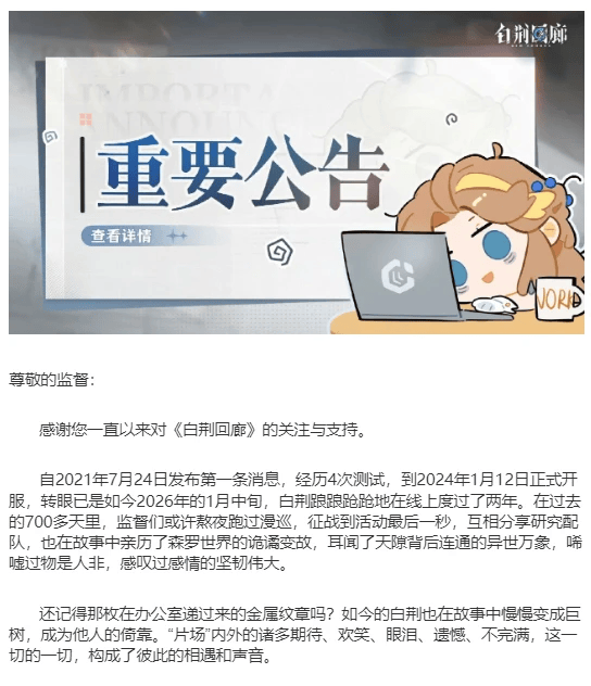 【6】1 月 14 日,网元圣唐旗下烛龙工作室发布《白荆回廊》致玩家信,宣布对游戏后续运营与更新机制进行调整。公告称,自 2026 年2月26日起(即1月15日版本结束后),游戏将不再推出新角色剧情内容,也将停止周期性推出全新版本。
