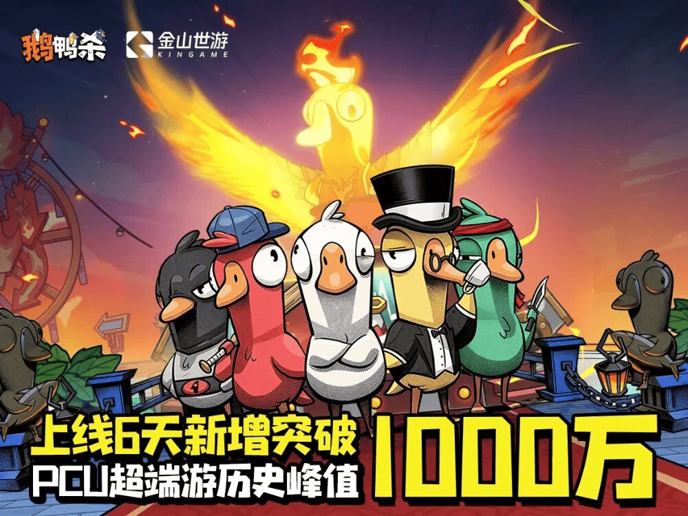 【4】1月13日,金山世游宣布其独家代理、虎牙联合发行的社交推理手游《鹅鸭杀》在国服上线仅 6 天,新增用户已突破 1000 万。该作国服最高在线人数已超过 Steam 端的历史峰值。