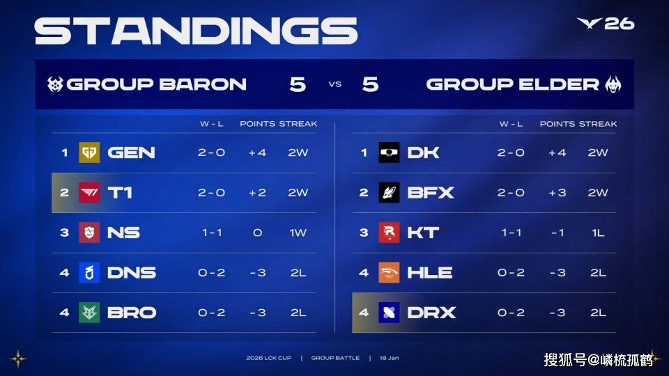 首周比赛结束后,LCK的远古龙组和大龙组打成5-5平