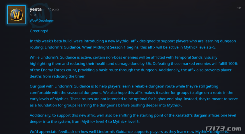 近日,为了能帮助新手T玩家快速熟悉大秘境路线,美测服上线了一个名为“林多尔米的指引”的新词缀,可根据玩家大秘境进度高亮显示非首领小怪,并降低其5%的生命值和造成的伤害,以便能凑够100%的进度。