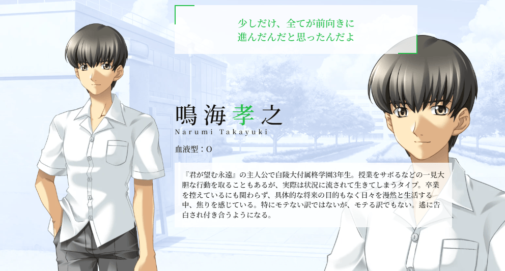 通过充足的游戏内容,去刻画人物的心理活动,以及人际关系的微妙变化,在积累了足够的情感链接后,再让现实残忍地将一切全部摧毁,将剧中角色、玩家与可能存在于现实中的矛盾,拧成一团——从某种意义上来说,尽管故事题材相去甚远,但《你所期望的永远》的确继承了《螺旋回廊》的优良血统,在那个信息传递速度受限的互联网黎明期,即使没有过激的残虐和凌辱情节,它也从另一个方向,将玩家们折腾得死去活来,以“优柔寡断”“不按玩家选择行动”而出名的男主角鸣海孝之,也成了当年最让人“不爽”的游戏主角。