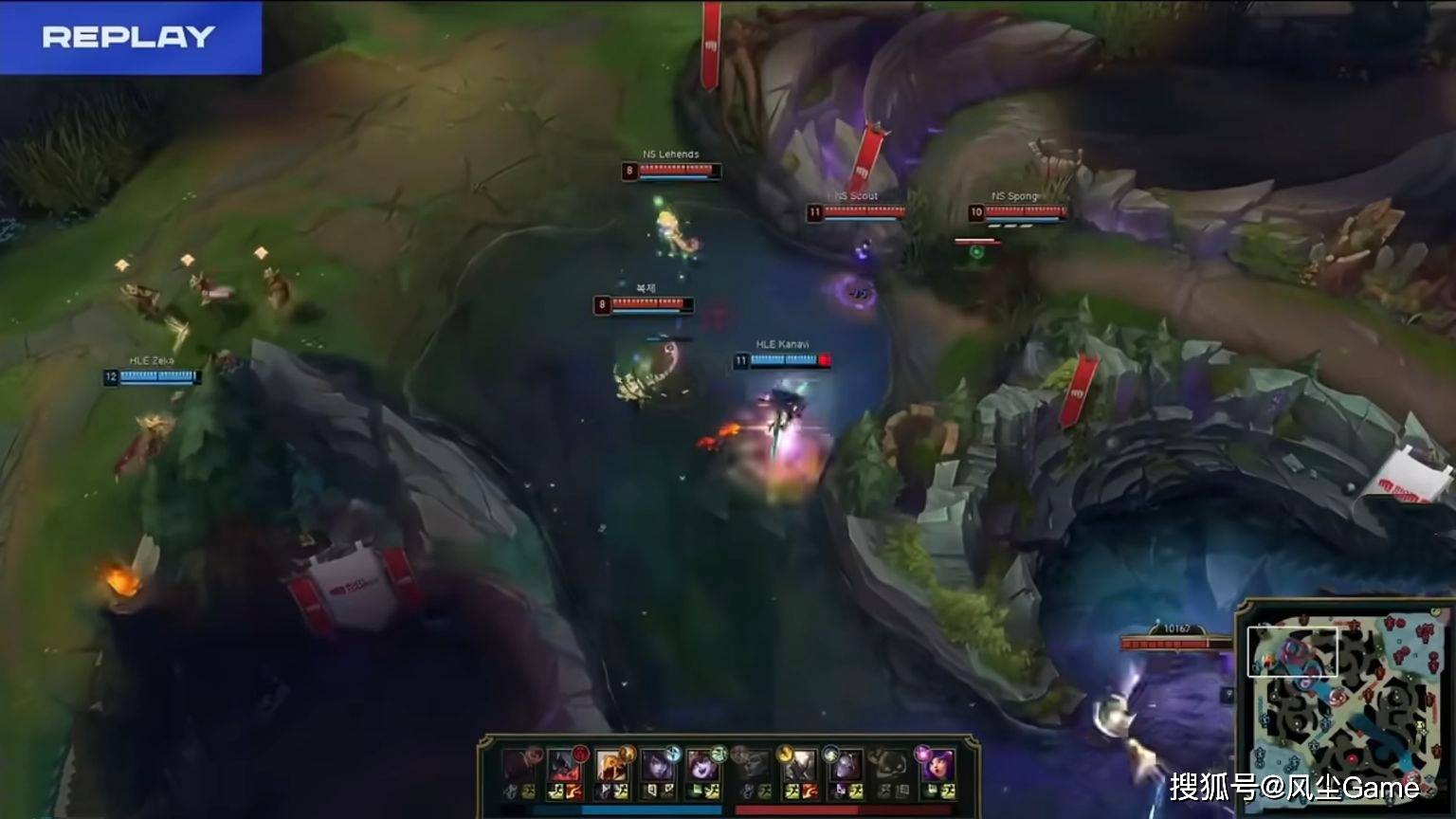 同一天的另一场比赛,是HLE大战NS,冠军中单、上单对决,还挺精彩的,赛前大家都觉得,NS打不过HLE,结果Scout连C两把,直接把银河战舰给零封了,简单复盘一下,看看HLE是怎么输的吧,第一把HLE前期优势挺大,Kanavi两次抓中,都打出击杀,Scout发条被打成0-2开局。