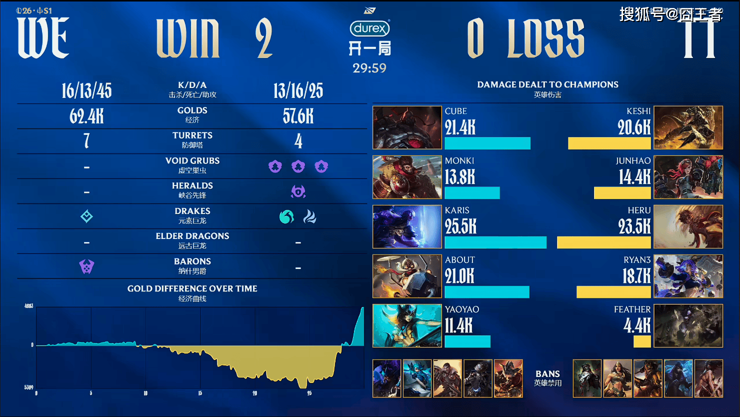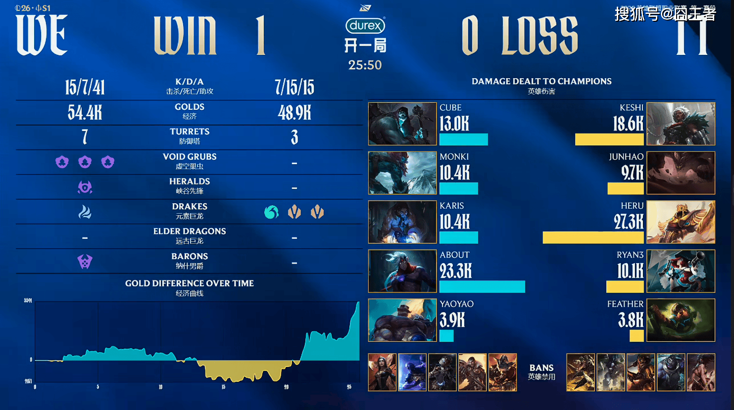 结果第一局比赛,双方大打出手,经济几经反转,WE笑到了最后。11分钟左右,Cube传送上线遭到TT上野集火击杀;21分钟左右,WE全员极限锁血打出团灭,随后顺势拿下大龙;最终25分50秒,WE团战再次大胜,随后一波。