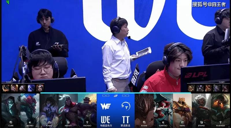 第一局比赛,WE蓝色方,禁用:兰博;杰斯;发条;瑞兹;妖姬,选用:Cube掘墓;Monki巨魔;Karis塞拉斯;About韦鲁斯;yaoyao布隆;TT红色方,禁用:阿卡丽;蒙多;皇子;牛头;鳄鱼,选用:Keshi狼母;Junhao石头人;Heru沙皇;Ryan3女枪;Feather泰坦