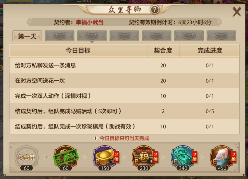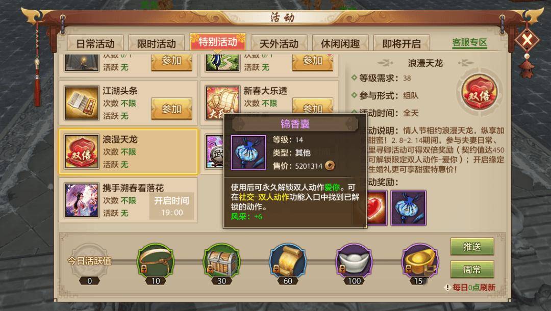 在此期间,完成众里寻卿契约且契约值达到450还可得限定双人动作道具-锦香囊(使用后可永久解锁双人动作-爱你,之前已获得的少侠可兑换大量铜钱)。