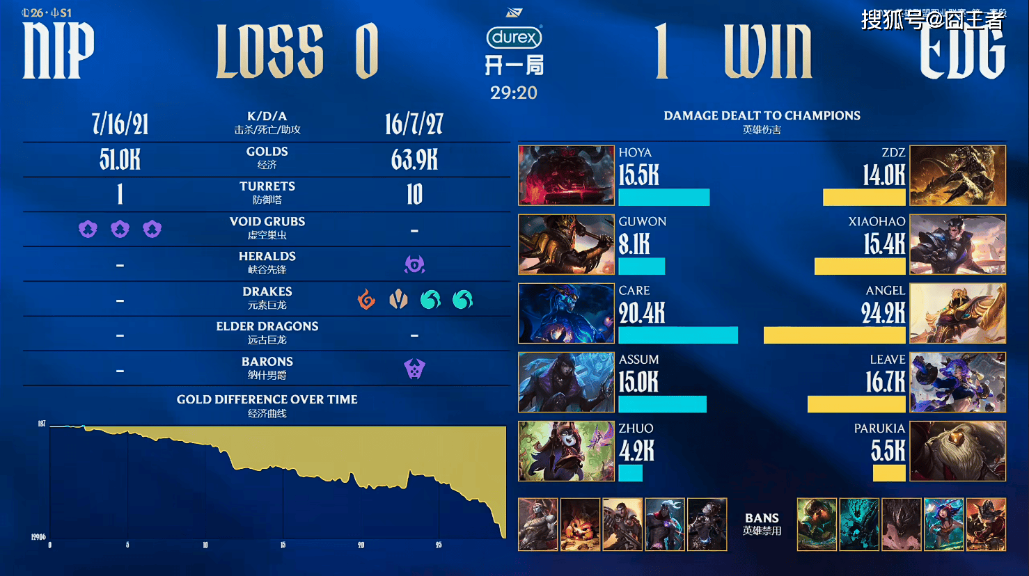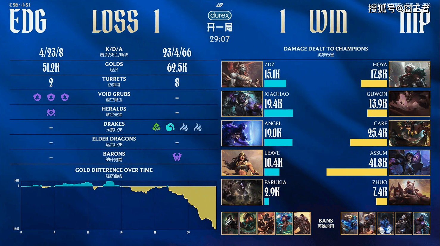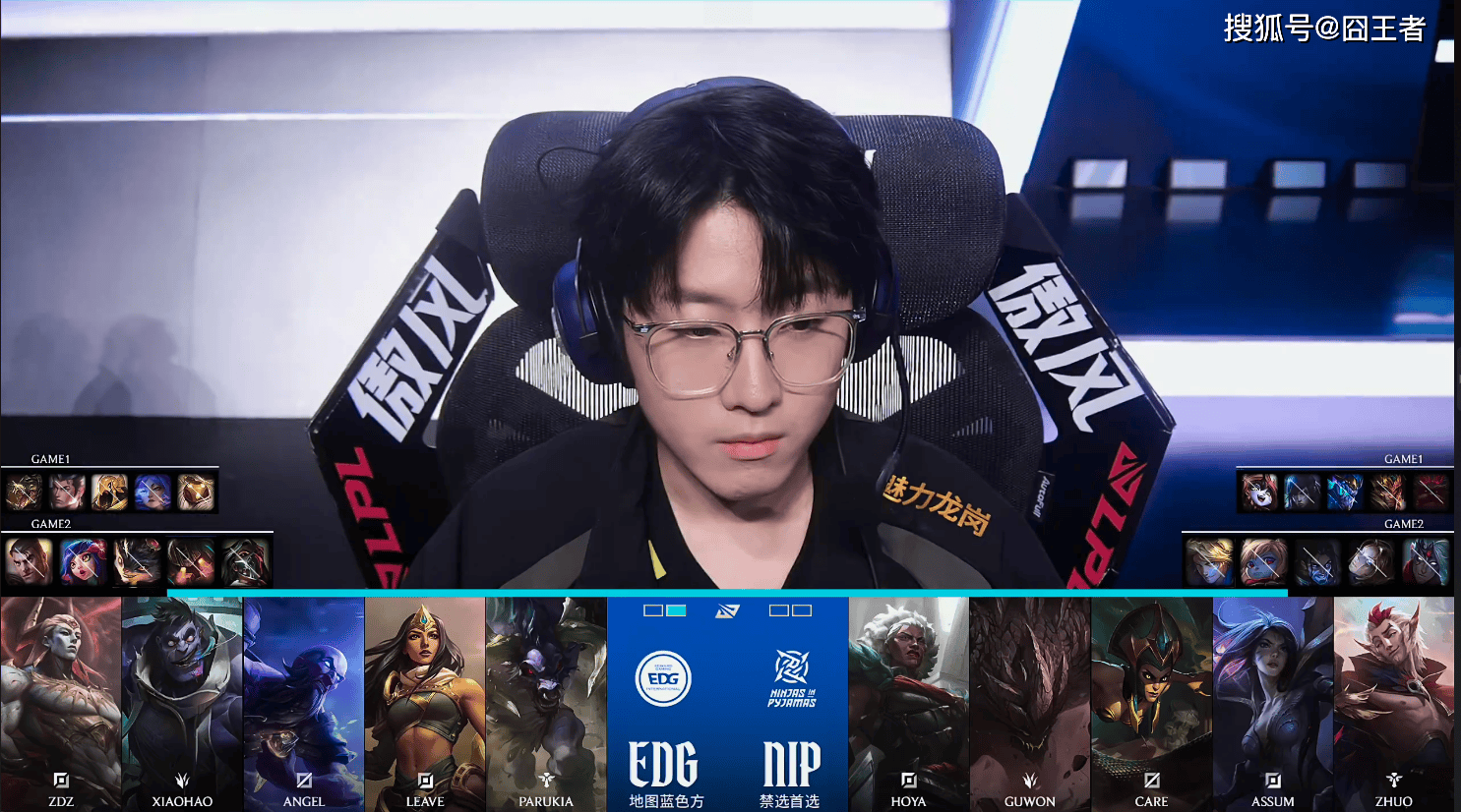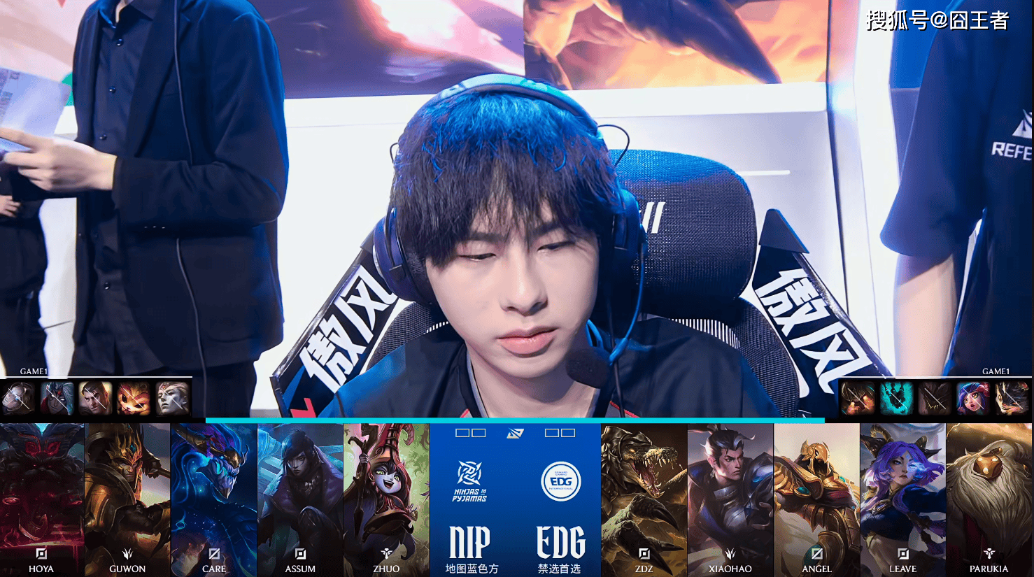 第一局比赛,NIP蓝色方,禁用:发条,韦鲁斯,杰斯,纳尔,亚恒,选用:Hoya奥恩,Guwon皇子,Care龙王,Assum厄斐琉斯,Zhuo璐璐;EDG红色方,禁用:兰博,妮蔻,石头人,锤石,泰坦,选用:ZDZ鳄鱼,Xiaohao赵信,Angel沙皇,Leave芸阿娜,Parukia巴德